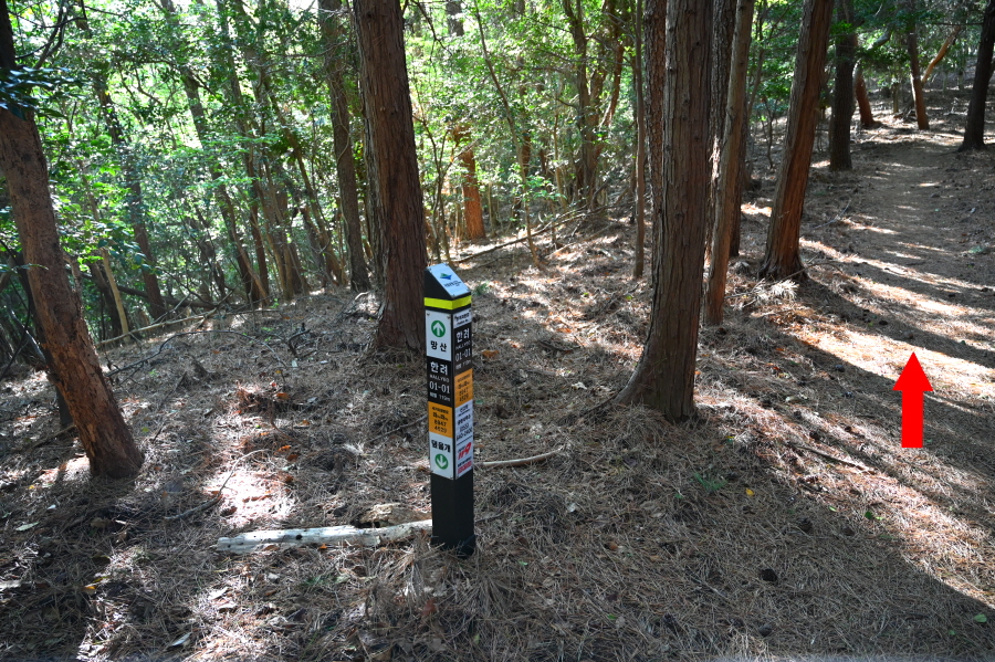 ‘한려 01-01 현위치 번호’ 표지목이 나오며, 일정한 거리를 두고 진두마을로 내려가는 내내 함께 합니다.