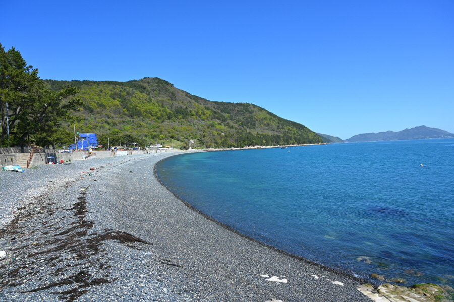 수군이 진을 치고, 추봉도와 사이에 좁은 해협을 연결하는 나루터에서 유래한다는 진두마을버스정류장은 왼쪽으로 꺾어 2분이면 도착합니다. 진두마을은 한산면소재지로 선착장에 광장을 넓게 조성했습니다. 남쪽에 보이는 작은 마을은 1419년(세종 1) 이종무 장군이 대마도 정벌을 나섰던 추봉도 봉암 마을입니다. 몽돌해수욕장이 알려졌습니다.