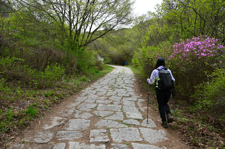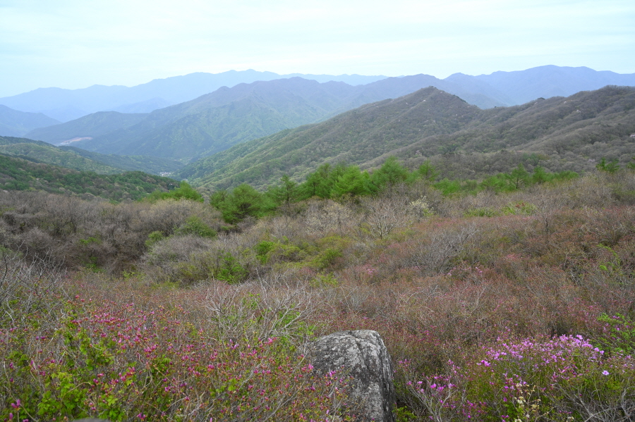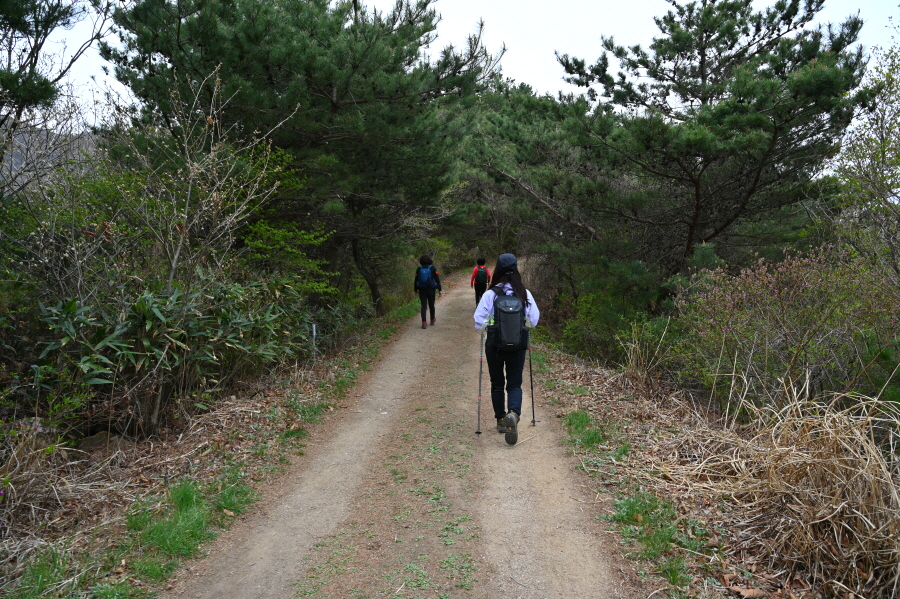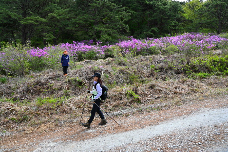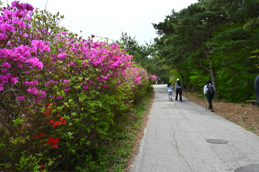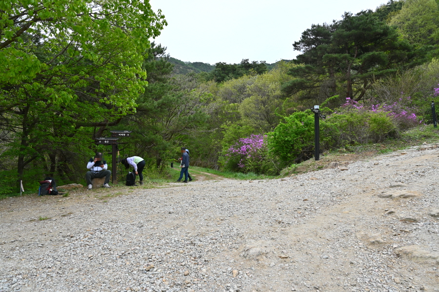 아직 정상과 능선에는 꽃이 피지 않아 이곳 철쭉을 카메라에 담았습니다. 15분이면 임도 삼거리에 도착합니다.
