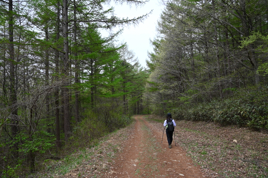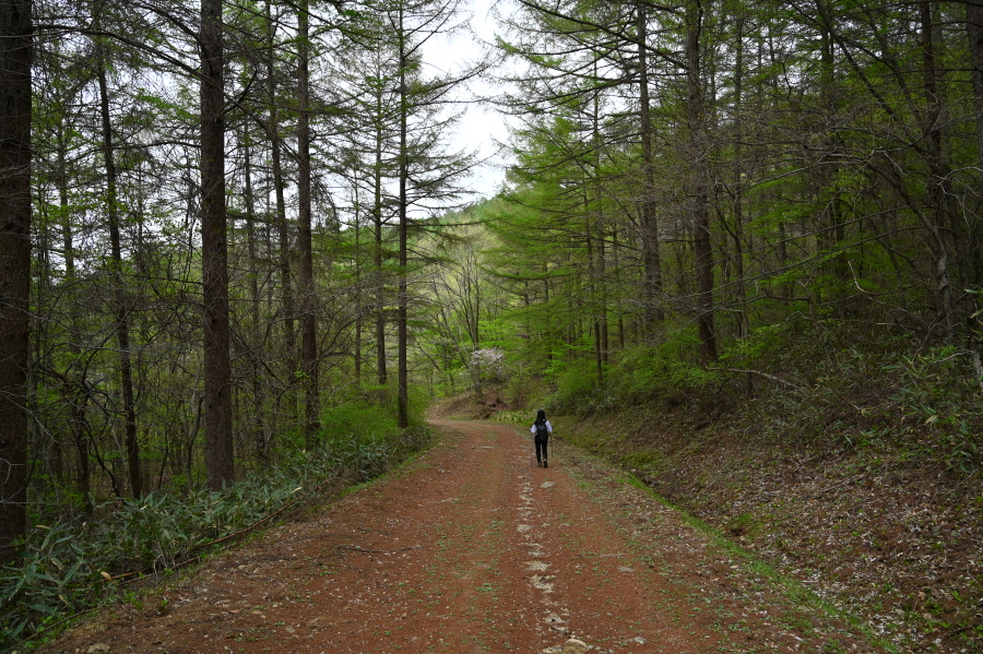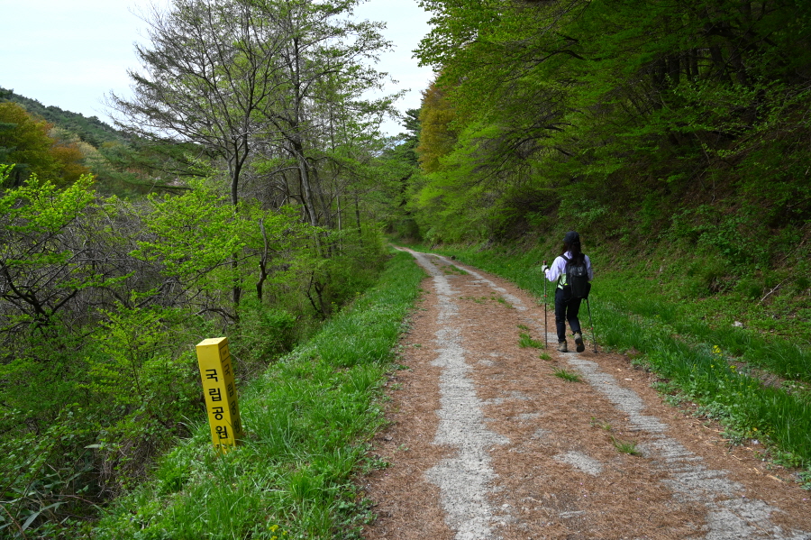아름드리 이깔나무 숲길을 약 13분 내려가면 임도에 내려섭니다. 오른쪽 산덕 마을로 갑니다.