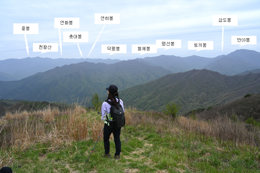 동쪽의 울퉁불퉁한 지리산 주봉인 천왕봉에서 시계방향으로 제석봉 장터목 연하봉 촛대봉 영신봉 찰성봉 덕평봉 형제봉 명선봉 토끼봉 삼도봉 반야봉 노고단 세걸산 만복대 고리봉이, 서쪽 운봉 읍 뒤로 수정봉 여원재 고남산 만행산 대성산이 파노라마로 펼쳐집니다.