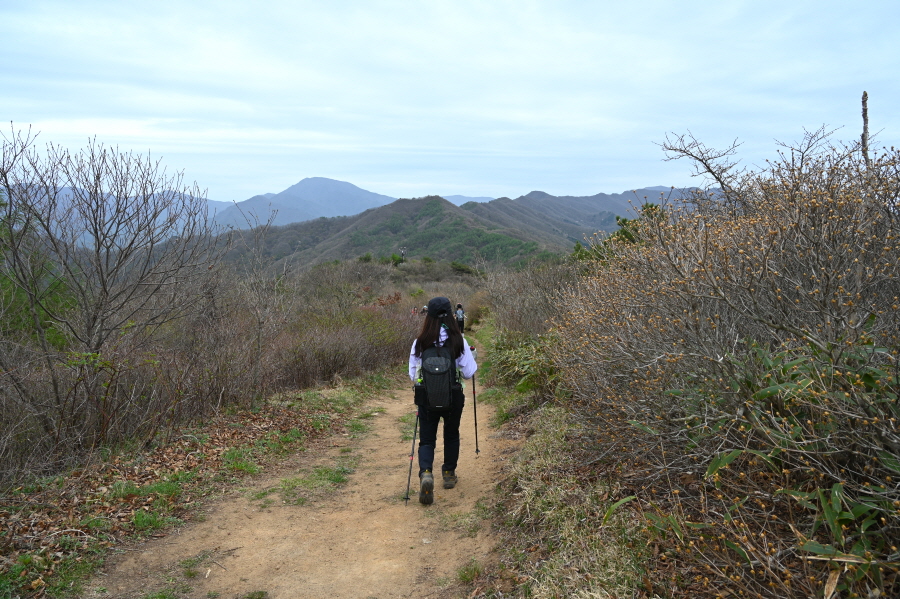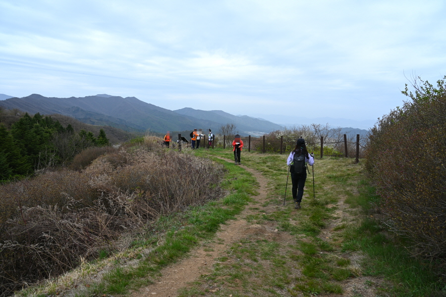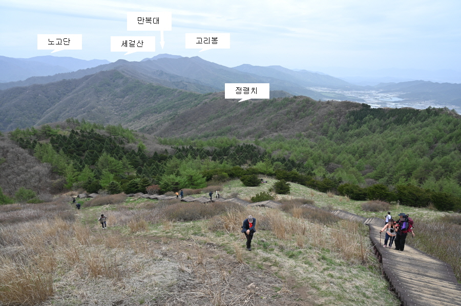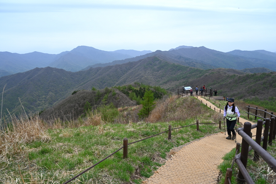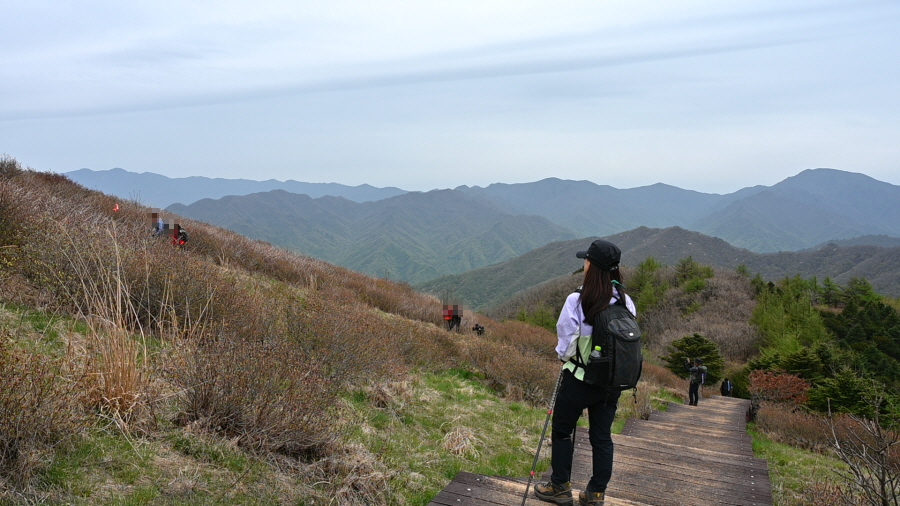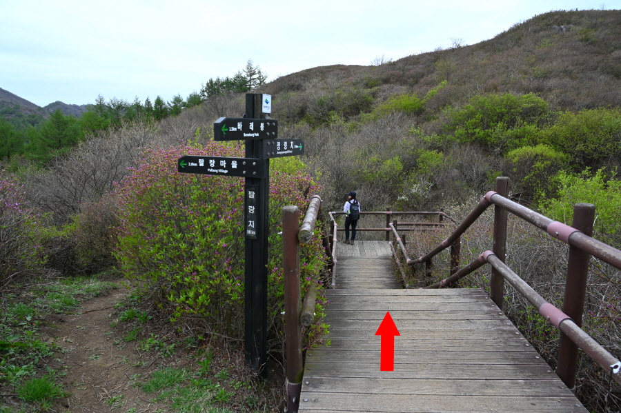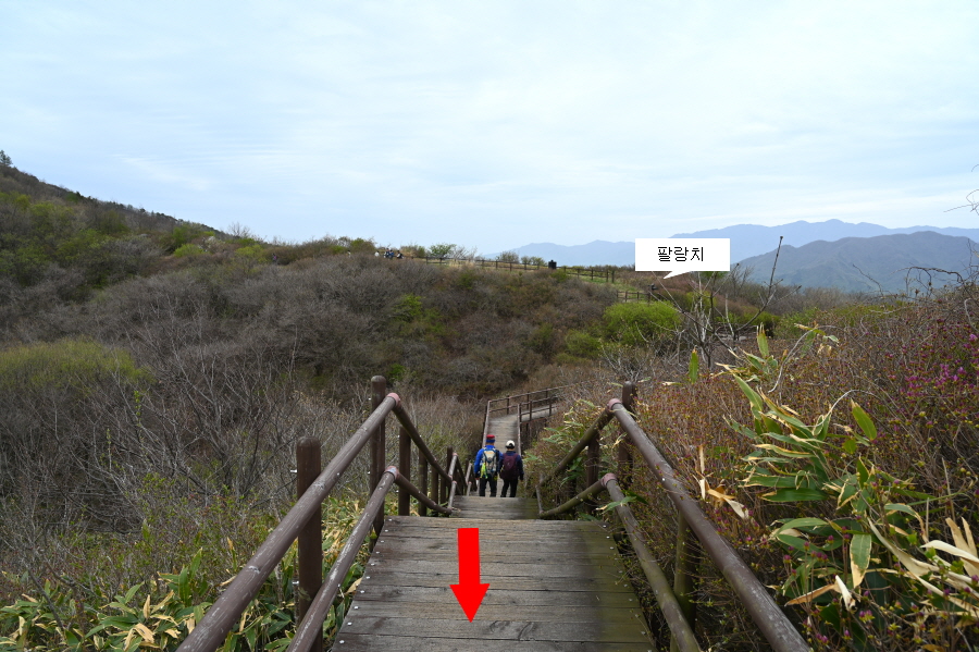 현재 산덕 마을길은 폐쇄됐고, 왼쪽 팔랑 마을로 내려가는 길은 지정 탐방로라 열려 있습니다. 필자는 오른쪽 정령치(7.9㎞) 방향으로 가는데, 산철쭉 군락에 나무 덱이 깔렸습니다.