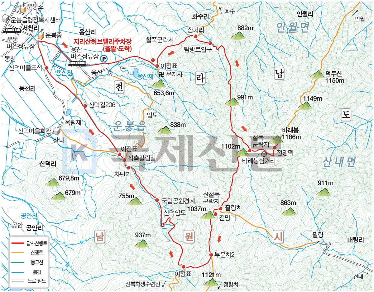 산행경로를 보면 지리산허브밸리 주차장을 나와 운지암 갈림길~탐방로 입구~잇단 안전 쉼터~바래봉 삼거리~샘터~바래봉 정상~바래봉 삼거리~팔랑치~부운치 2~산덕 임도~차단기~산덕 마을·허브밸리(용산마을) 갈림길~산덕 마을 표석~도로 삼거리~용산버스정류장~지리산허브밸리주차장으로 되돌아오는 원점회귀입니다. 산행 거리는 약 14㎞이며, 5시간30분 안팎 걸립니다.