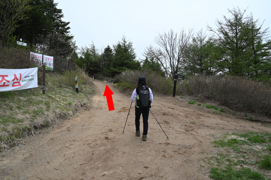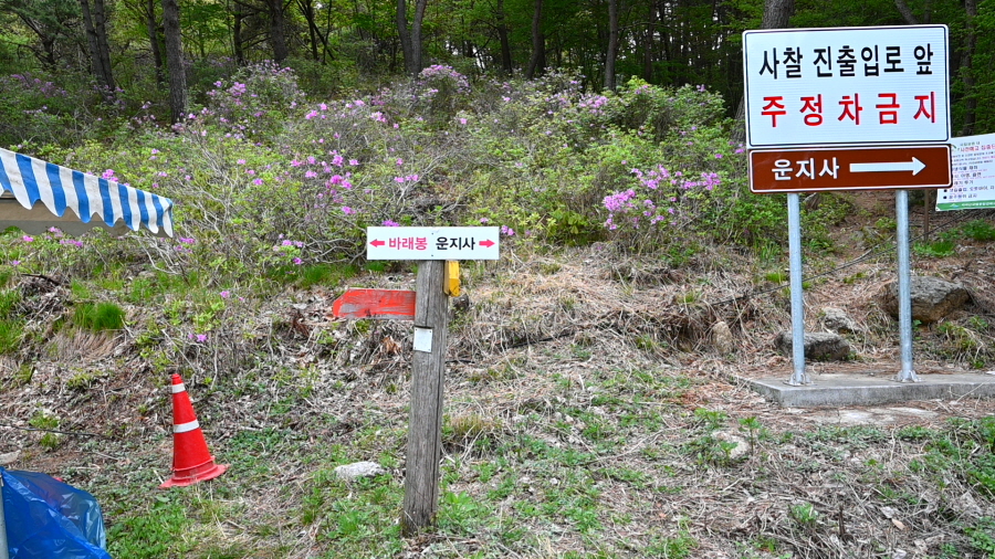 바래봉(3.5㎞)은 오른쪽으로 꺾어 열린 차단기를 지납니다. 직진은 화산 마을에서 올라오는 길.