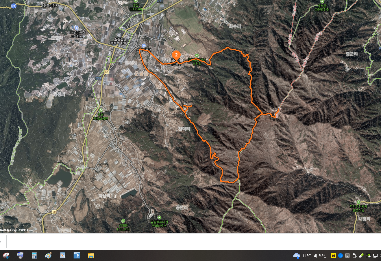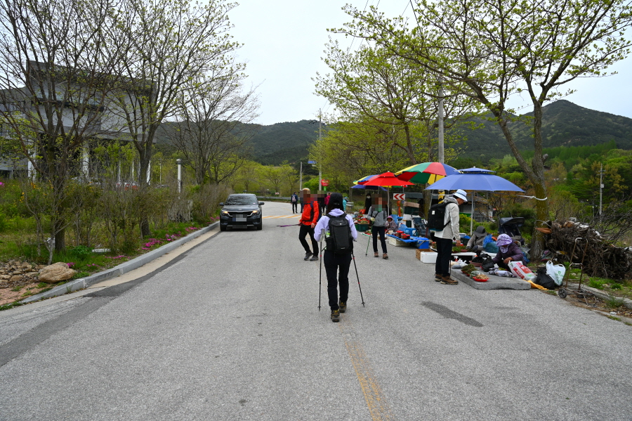 정면에 백두대간 능선의 수정봉과 고남산을 보며, 35분이면 산덕마을 표석을 지나 삼거리 도로에 닿습니다. 허브밸리 주차장은 오른쪽으로 꺾어 15분이면 도착합니다.