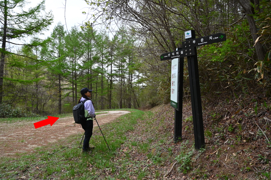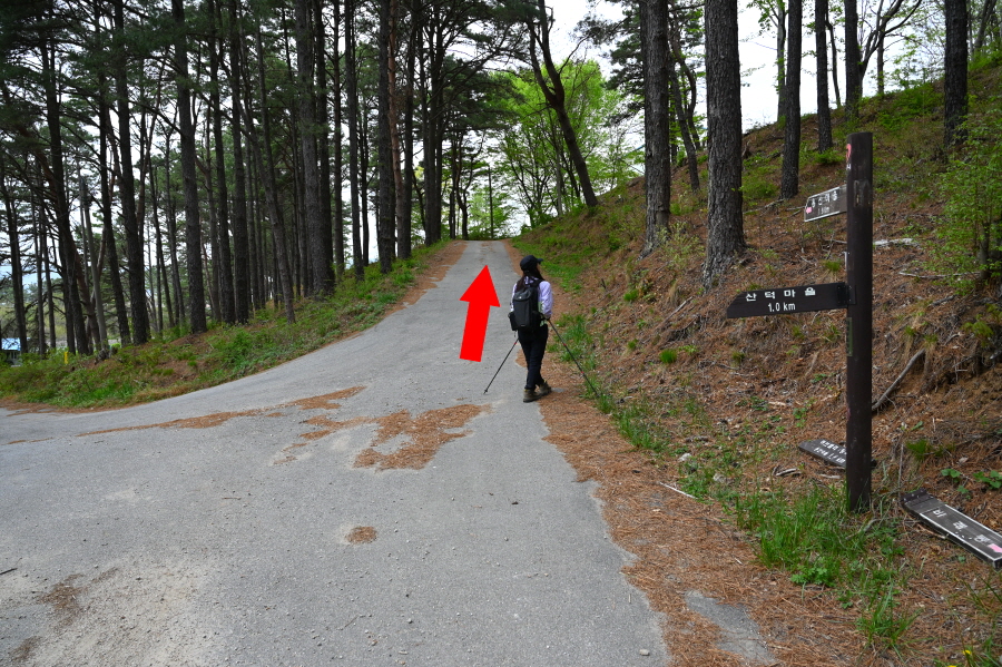 다시 5분이면 임도 삼거리에서 오른쪽 용산마을·허브 밸리로 갑니다. 왼쪽은 산덕 마을 방향.
