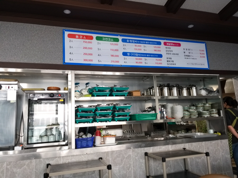돔 코스는 2인 150000원~5인 300000원, 자연코스 2인 120000원~5인 210000원, 회·탕정식 2인 90000원~5인 180000원, 탕·구이정식 2인 50000원~5인 110000원, 회덮밥 1인 15000원, 물회 1인 18000원, 전복물회 1인 25000원