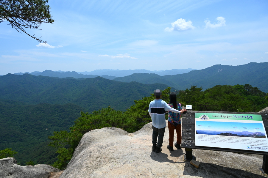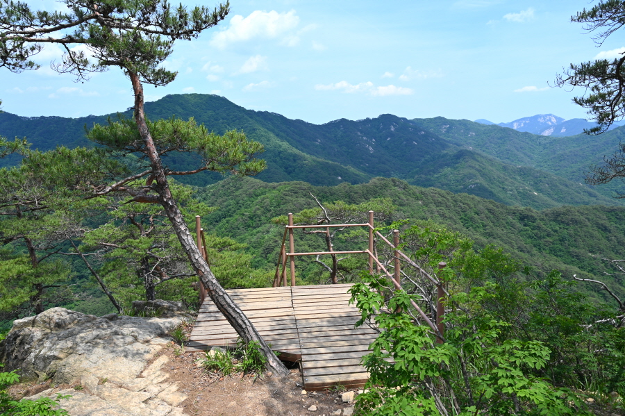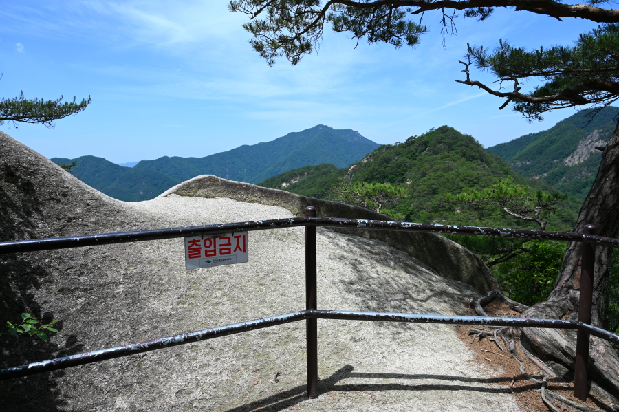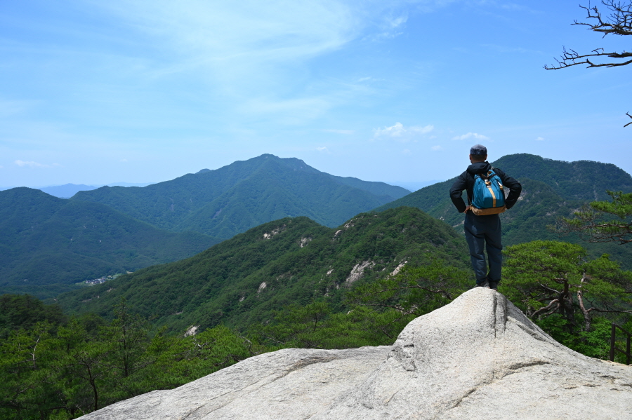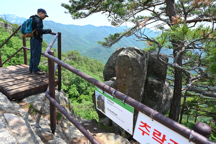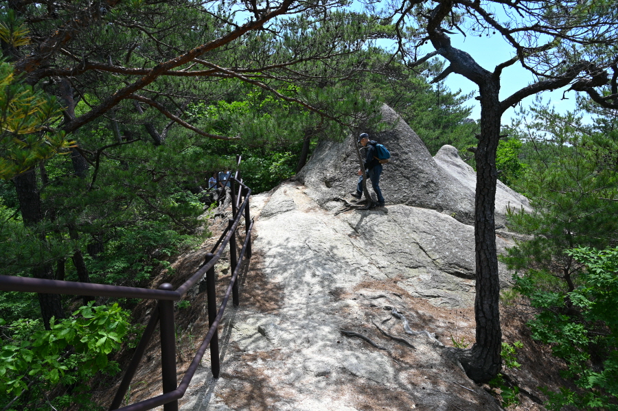 다시 덱 계단을 올라가면 ‘신사의 품격’을 상징하는 중절모 바위를 지나 편평한 암반에 조망이 열립니다. 가운데 오똑한 바위는 ‘버선코’를 닮았다합니다. 멋들어진 소나무와 울퉁불퉁한 바위 능선은 한폭의 진경산수화를 옮겨 놓았습니다.
