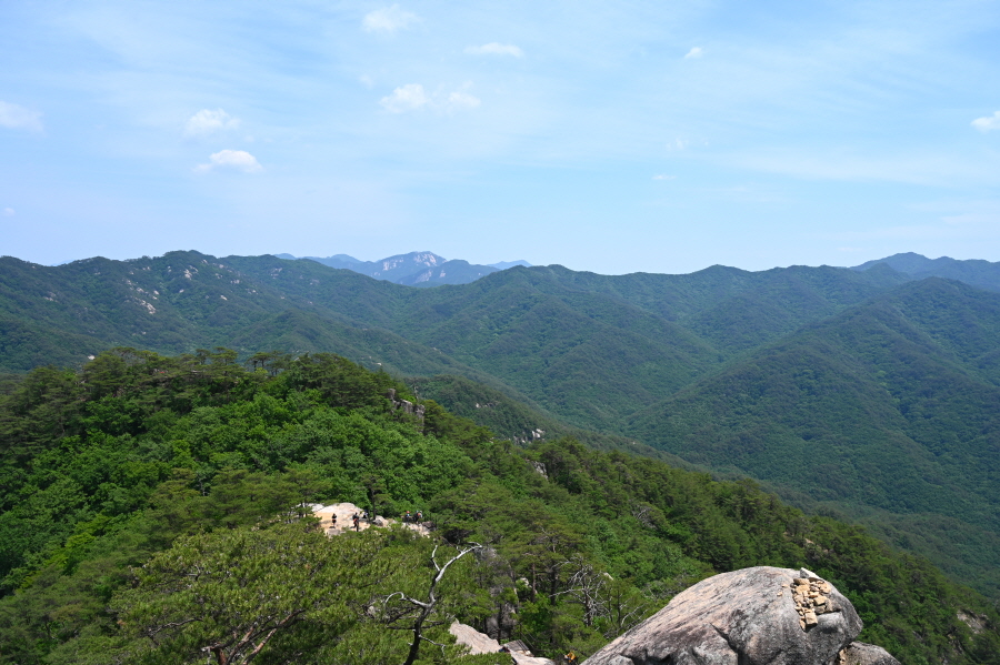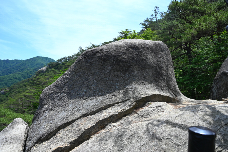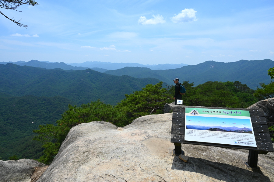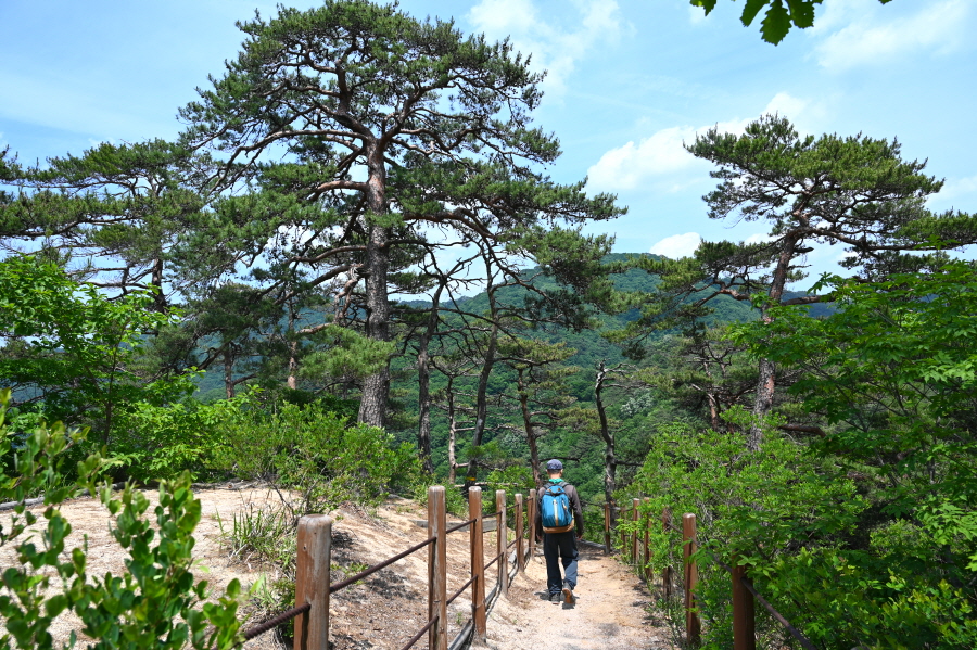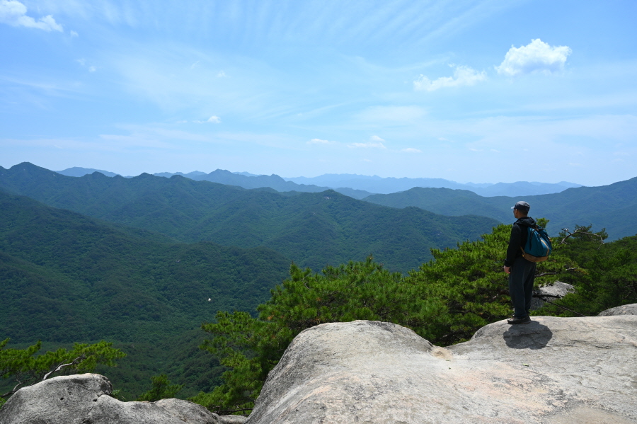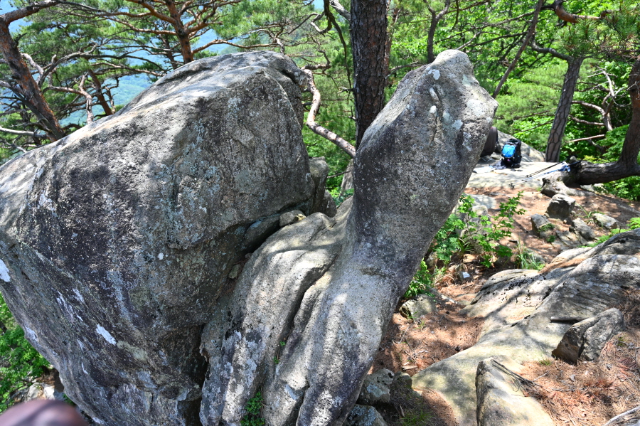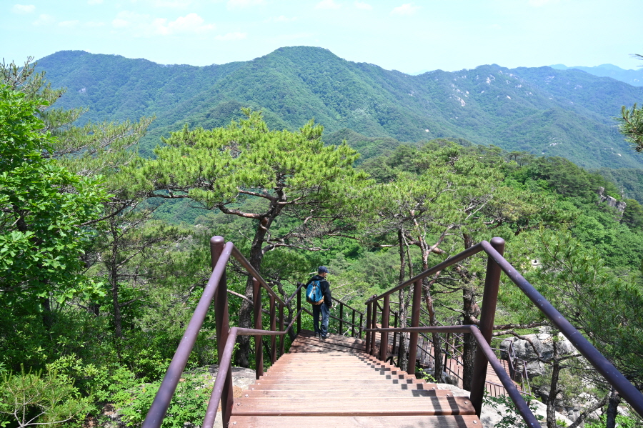 다시 덱 계단을 올라가면 ‘신사의 품격’을 상징하는 중절모 바위를 지나 편평한 암반에 조망이 열립니다. 가운데 오똑한 바위는 ‘버선코’를 닮았다합니다. 멋들어진 소나무와 울퉁불퉁한 바위 능선은 한폭의 진경산수화를 옮겨 놓았습니다.
