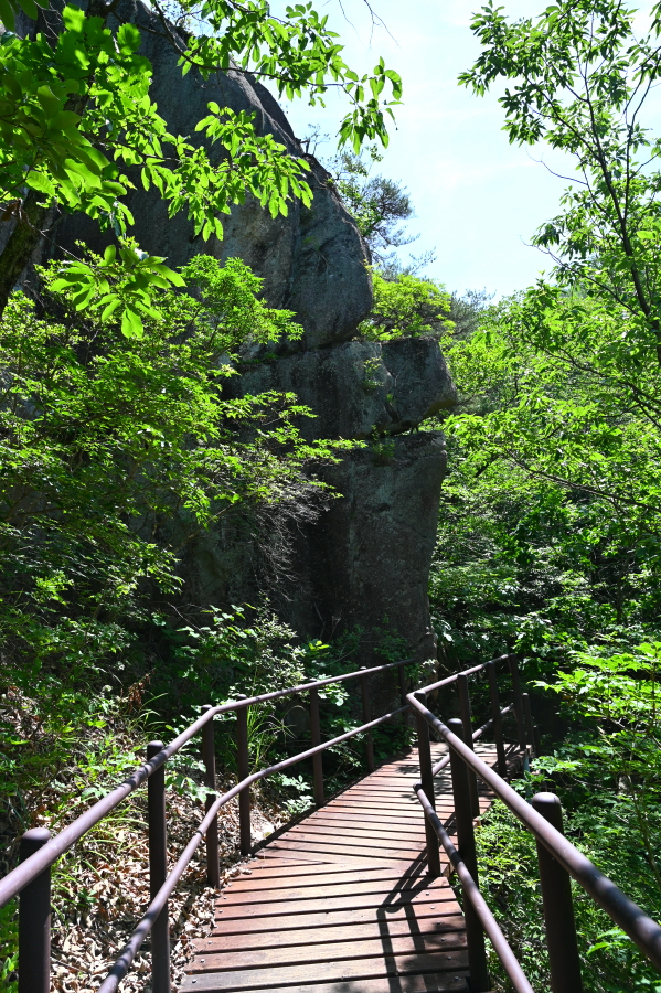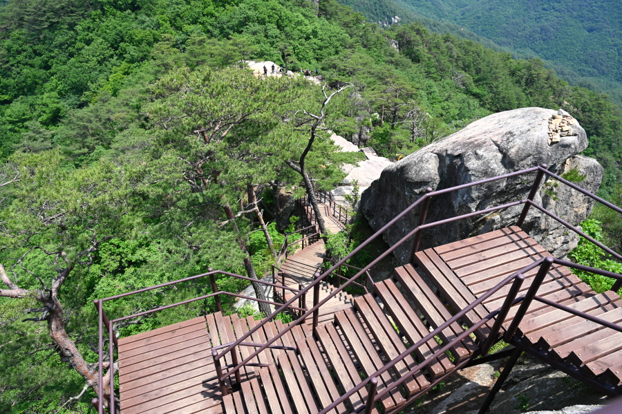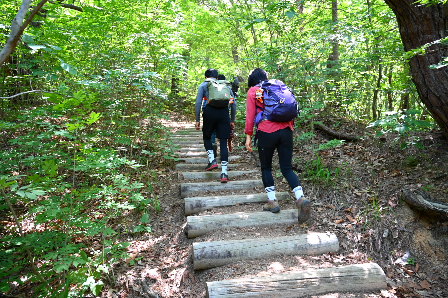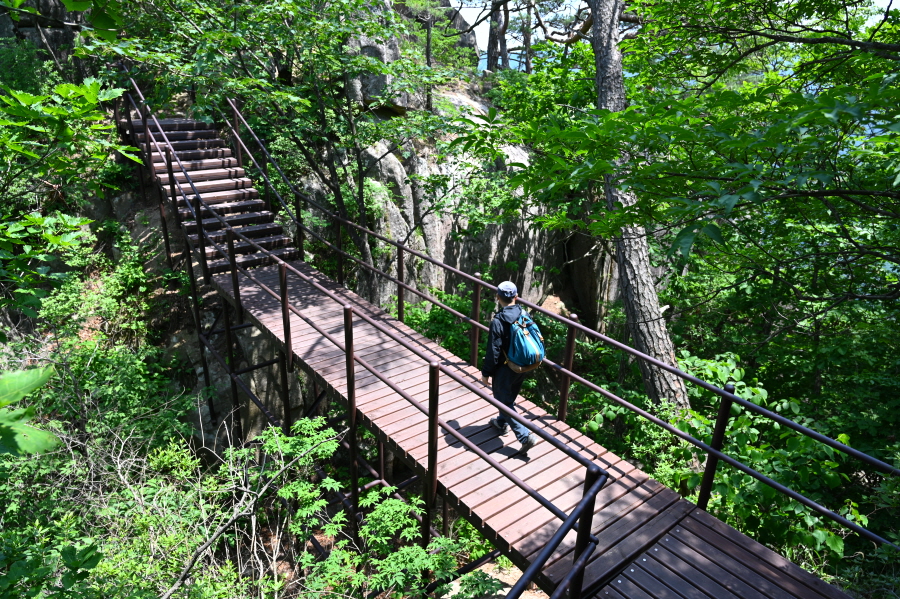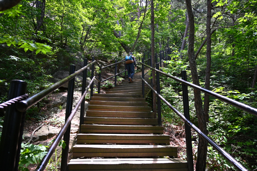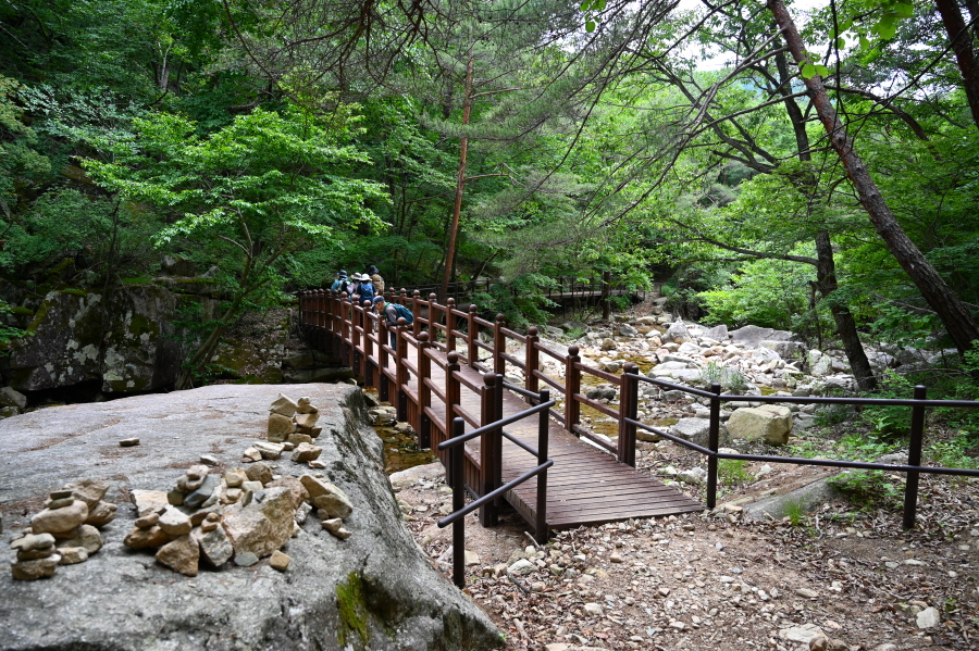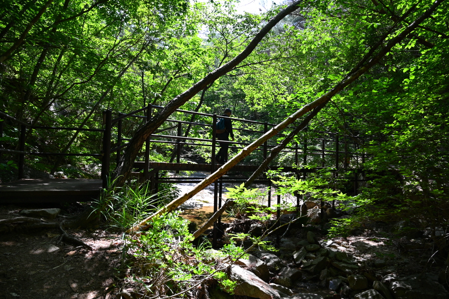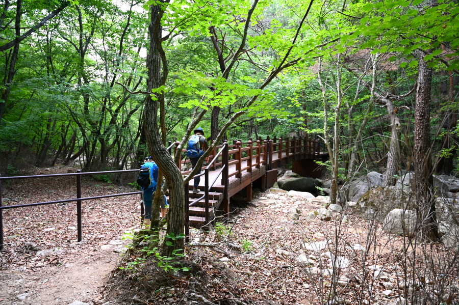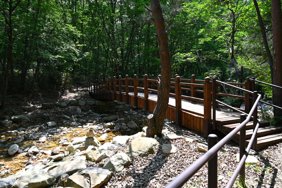 계곡에 놓인 다리를 건너기도 하고 덱 계단과 돌계단 통나무 계단을 오르기도 합니다.