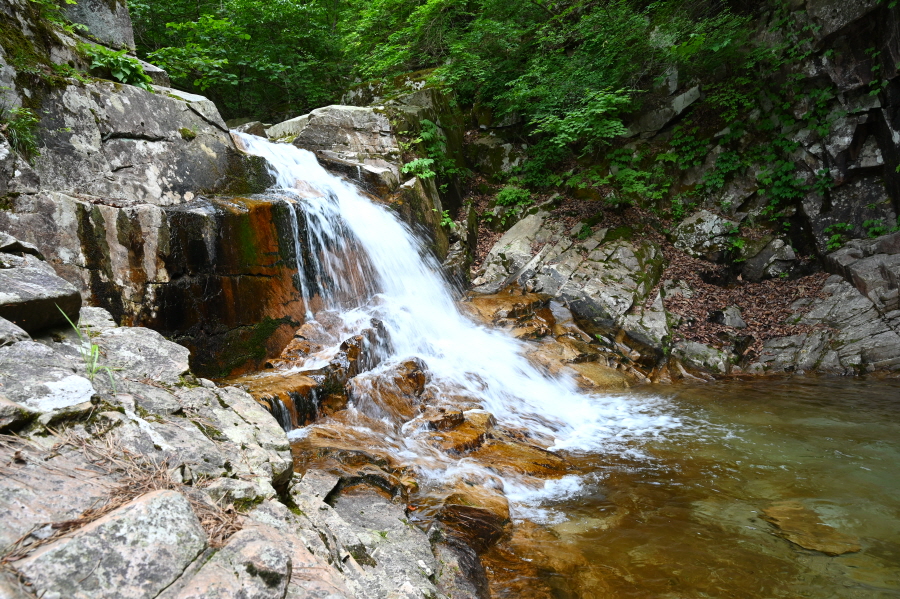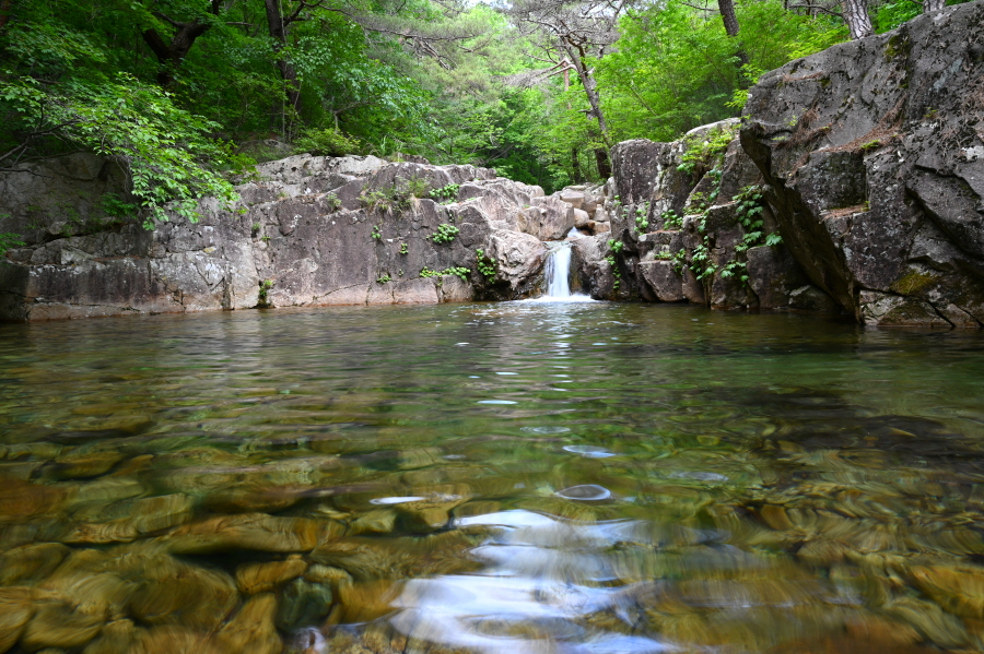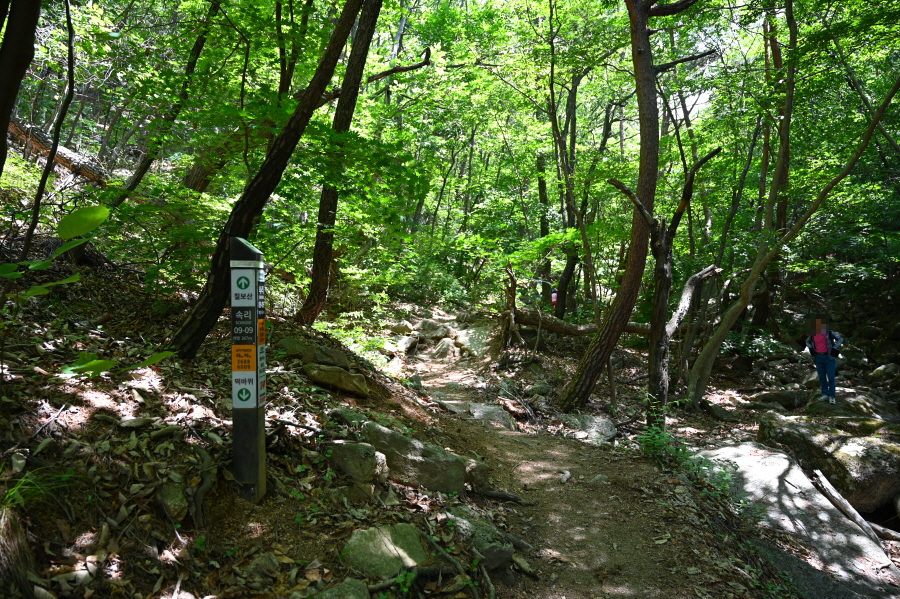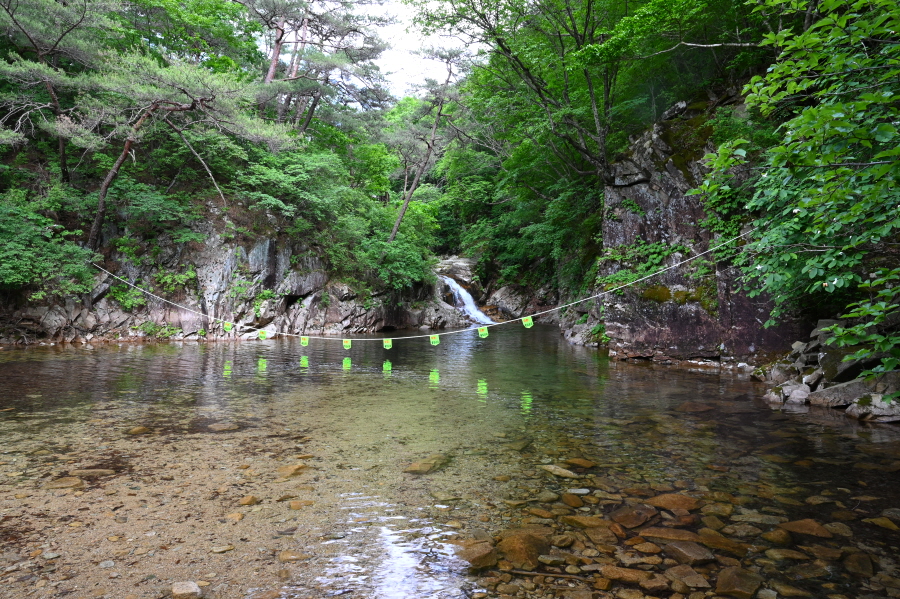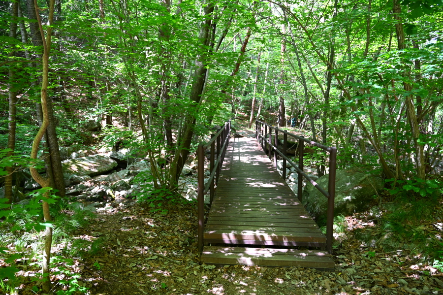 소와 작은 폭포가 연이어 나타나고 잇단 목교를 건너갑니다. 약 30분이면 왼쪽 장성봉에서 내려오는 길과 만나 오른쪽 절말주차장(1.2㎞)으로 꺾습니다.
