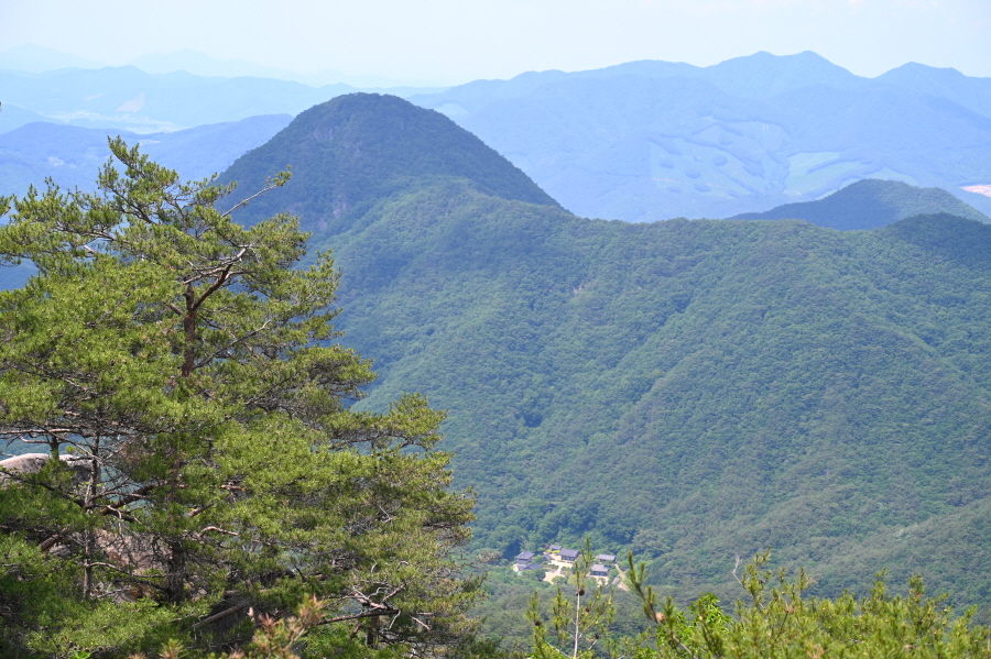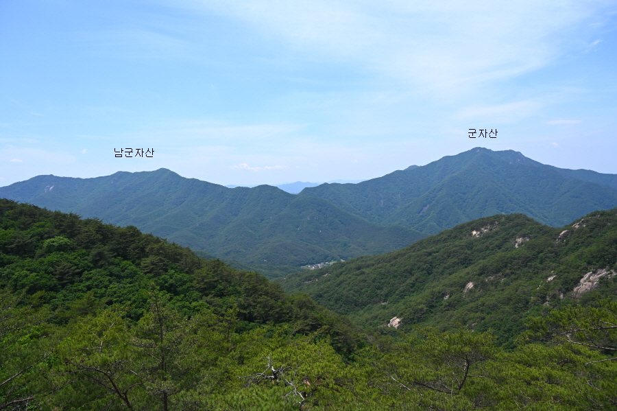 가파른 길에 놓인 덱 계단을 올라가면 왼쪽에 처음으로 전망대가 나옵니다. 가운데가 잘록해 안장 바위로 불립니다. 정면에 보배산과 왼쪽에 군자산이, 오른쪽 골짜기 안에 각연사가 보입니다.