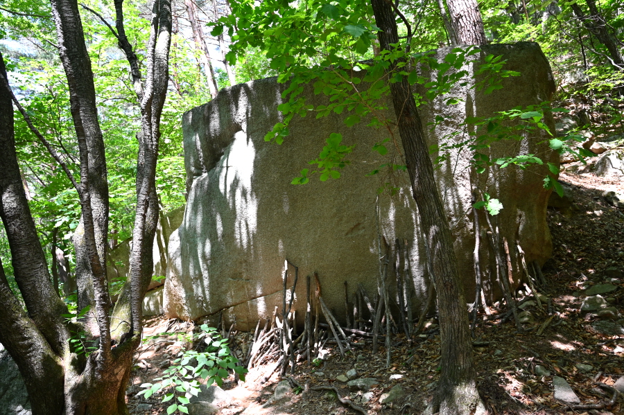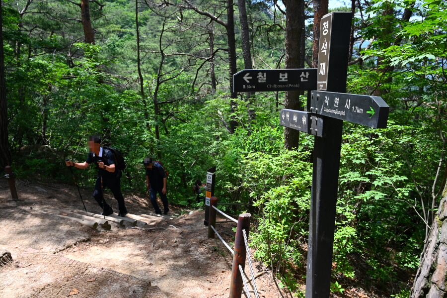 물소리는 잦아들고 집채만한 바위를 돌아 잠시 된비알을 올라 떡바위 분기점에서 약 1시간이면 청석재에 올라섭니다. 칠보산(0.6㎞)은 오른쪽으로 꺾습니다. 왼쪽은 보배산 가는 길로 폐쇄되었고, 안전 쉼터와 각연사에서 올라오는 산길이 있습니다.