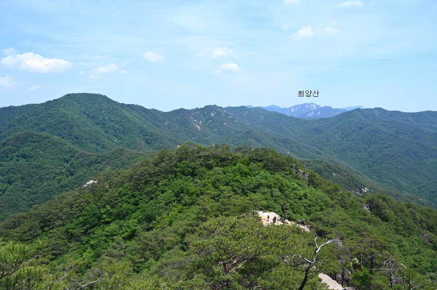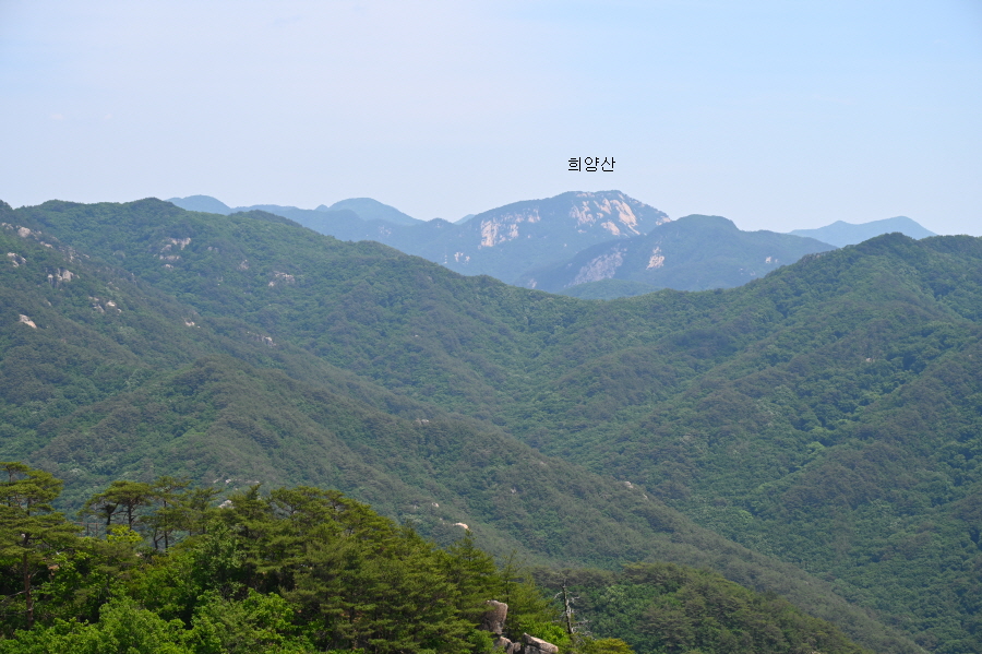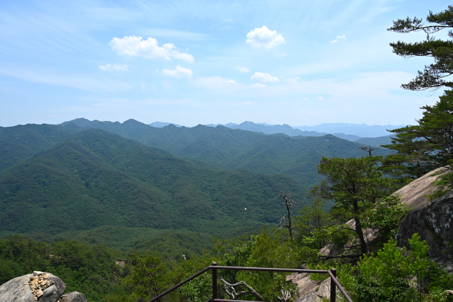 가파른 바위 능선에 놓인 덱 계단에서 동쪽 조망이 시원하게 열립니다. 덕가산과 악휘봉 사이에 하얀 암반을 이고 선 희양산이 반짝이고, 오른쪽에는 백두대간 능선의 장성봉 대야산 속리산이 펼쳐집니다.