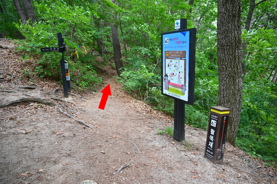 ‘안전쉼터 속리 -02’ 표지목이 서 있는 활목재입니다. 오른쪽 절말(3.6㎞)로 하산합니다. 왼쪽은 각연사로 내려가는 길이며, 악휘봉 덕가산 방향 직진 능선은 폐쇄되어 갈 수 없습니다.