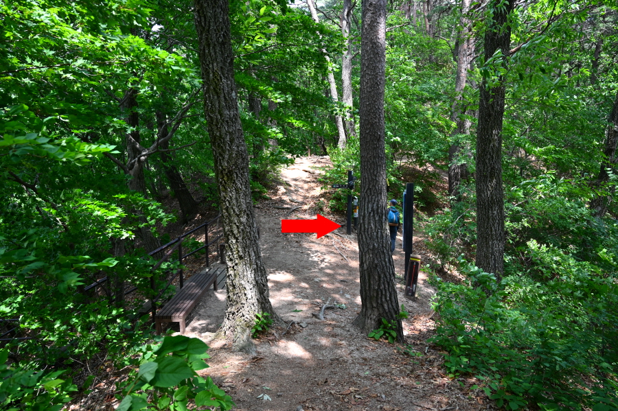 선바위를 돌아 서면 건너편 마당바위와 연결하는 다리가 놓였습니다. 칠보산 고스락을 향해 목을 쭉 뺀 거북바위를 보고 속리산 ‘정이품송’을 닮은 소나무를 지나 다시 덱 계단을 내려갑니다. 정상에서 30분이면 안부 사거리에 도착합니다.