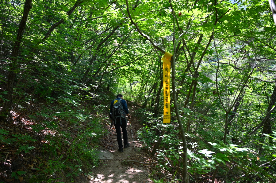문수암골을 오르는 산길은 아름드리 소나무와 활엽수가 하늘을 가리는 숲 그늘입니다. 산길은 현위치 표지목과 속리산국립공원 노란 리본이 길잡이가 되어 줍니다.
