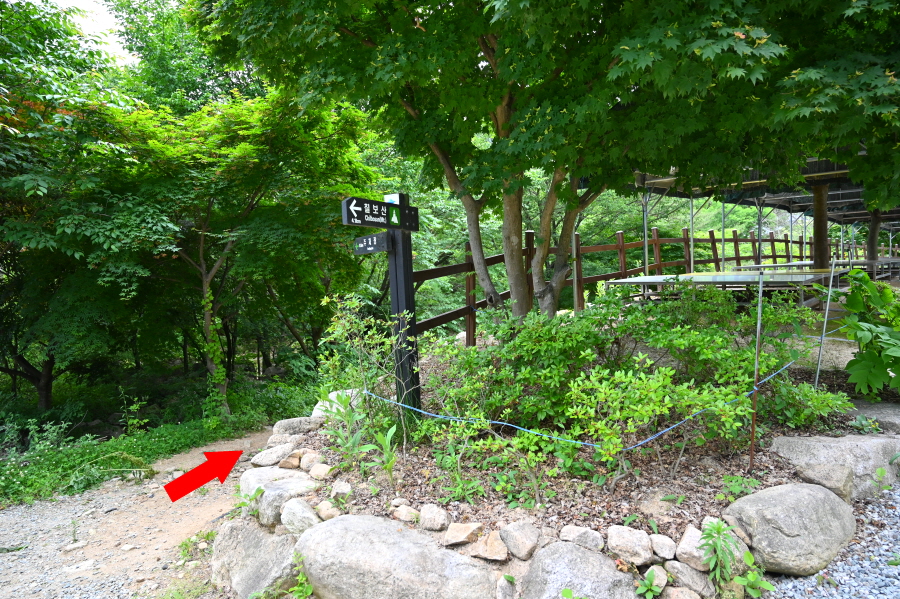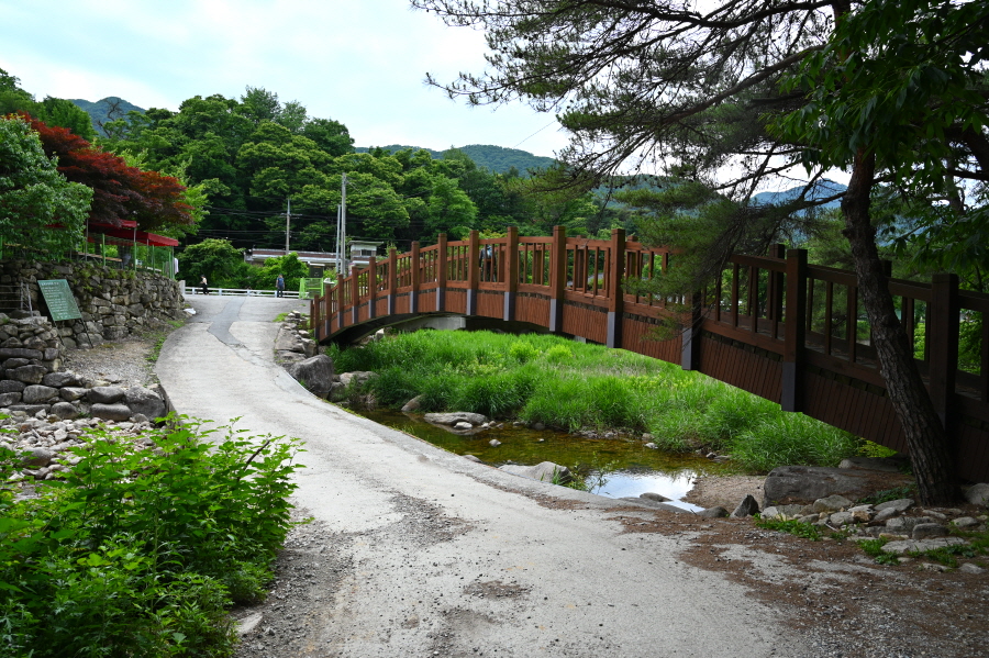 마사가 깔린 길을 내려 선 뒤 물 마른 지계곡을 따라 30분이면 살구나무골과 만납니다. 절말(2.4㎞) 이정표를 지나 나무다리를 건너면 산길은 넓어집니다.