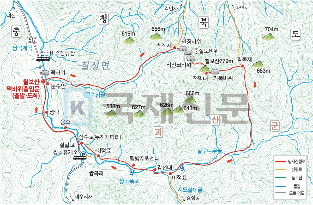 산행 경로는 다음과 같습니다. 괴산군 칠성면 쌍곡리 칠보산 떡바위 출입문~목교~문수암골~청석재~칠보산 정상~거북바위~활목재~살구나무골~절말주차장·장성봉 갈림길~탐방지원센터~쌍곡폭포~탐방지원센터~쌍곡폭포산장 앞 주차장 갈림길~절말 마을~517번 지방도를 따라 칠보산 떡바위 출입문으로 되돌아오는 원점회귀입니다. 산행 거리는 약 8㎞이며, 4시간 안팎 걸립니다.