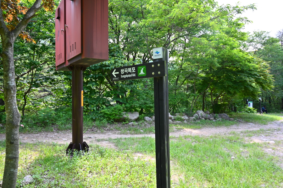 너른 소에 떨어지는 8m 와폭은 최근에 잦은 비로 물소리가 요란했습니다. 쌍곡폭포산장 앞의 주차장 갈림길에서 직진하면 잠수교와 무지개다리가 걸린 쌍곡계곡을 건넙니다.