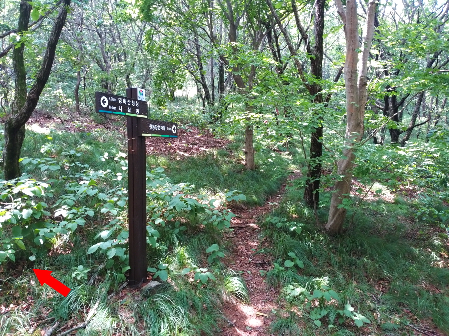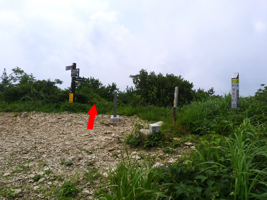 억새밭이 나오며 기둥만 남은 안부에서 왼쪽입니다. 약 5분이면 다시 안부에 이정표가 섰는 갈림길에 도착합니다.