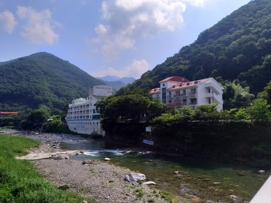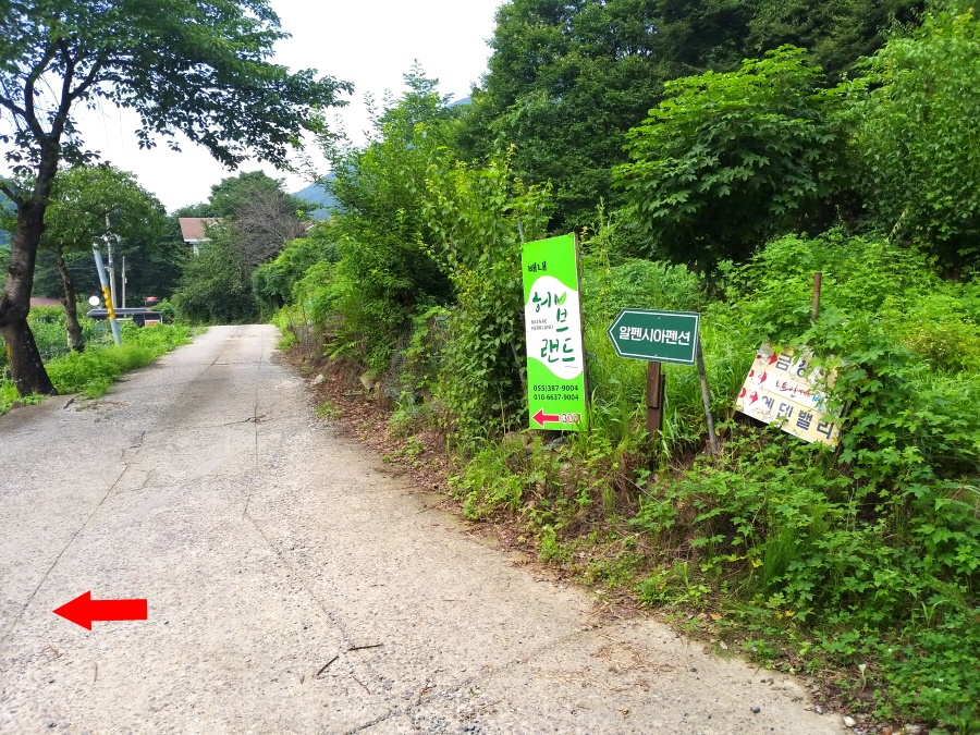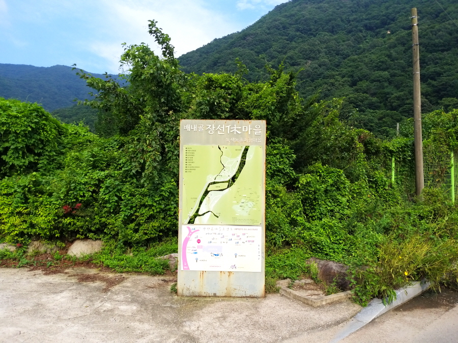 계곡 옆 바위에다 철망 선반을 달아 길을 만들었습니다. 영남알프스 안내도와 펜션를 거쳐 허브밸리펜션 안내판 삼거리에서 왼쪽 화장실 팻말 방향으로 꺾어 장선마을회관을 지납니다.