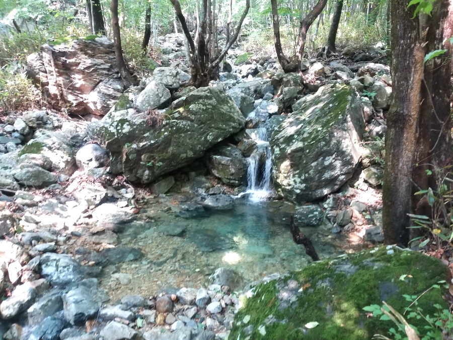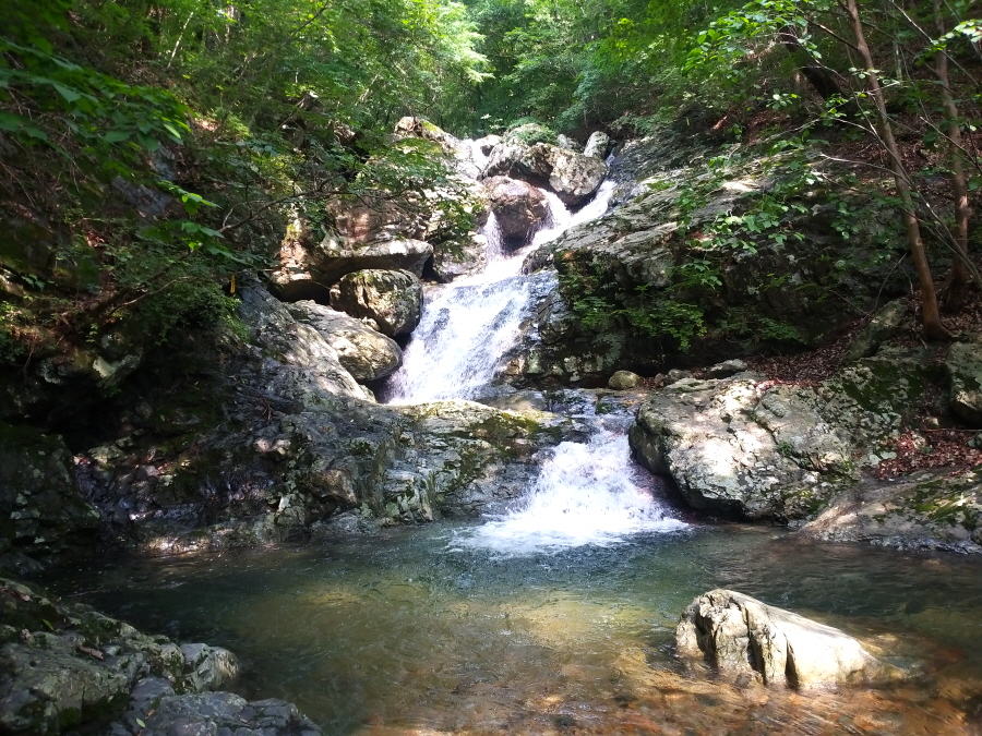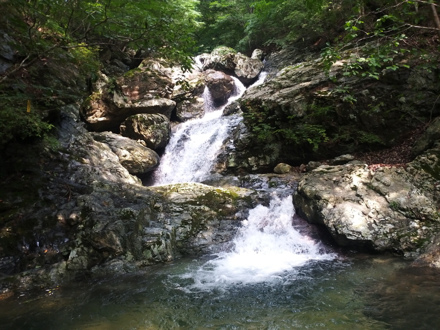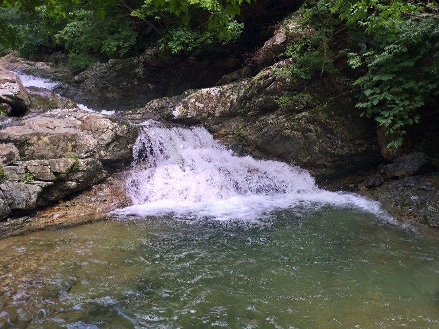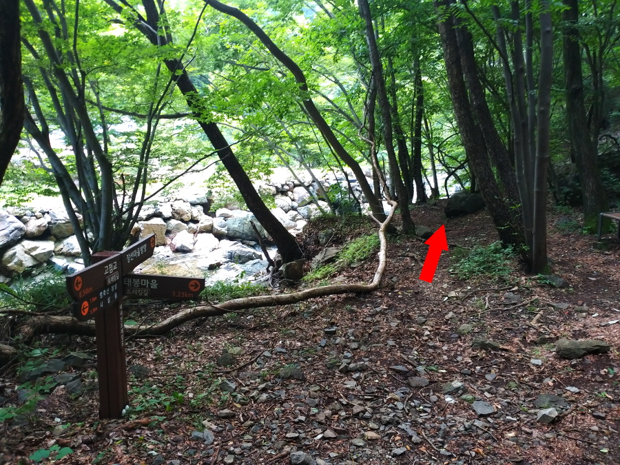 직진해 계곡을 따라 갑니다. 오른쪽은 시살등 방향 능선길입니다. 약 4.5분이면 청수좌골과 우골이 만나는 합수점에 걸린 와폭이 나옵니다. 여기서 오른쪽 계곡은 우골이며 왼쪽 계곡은 사유지로 출입이 통제된 좌골입니다.