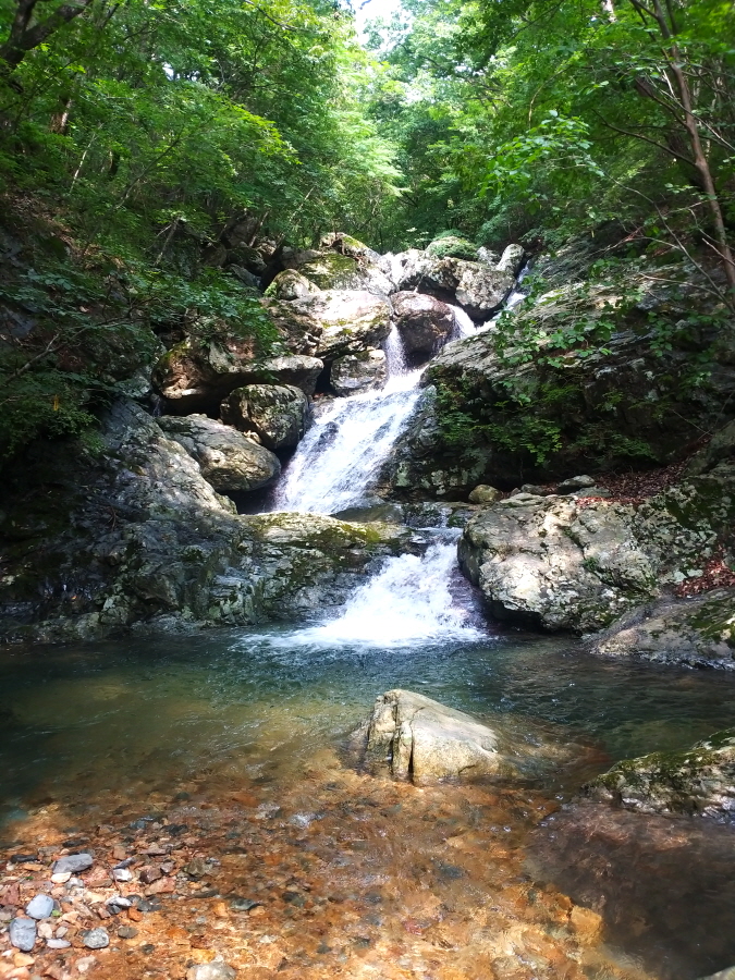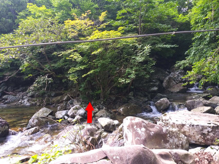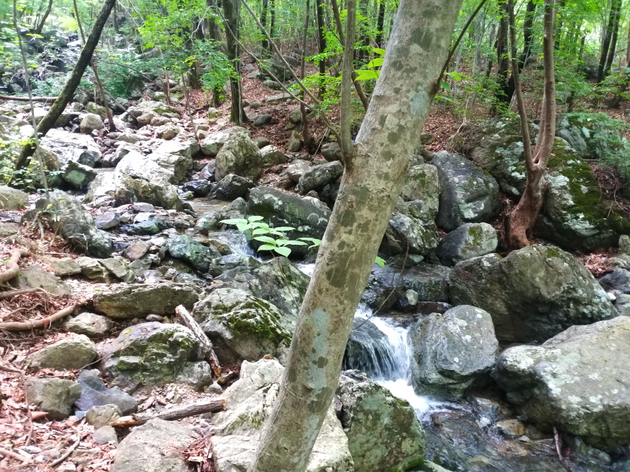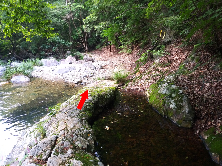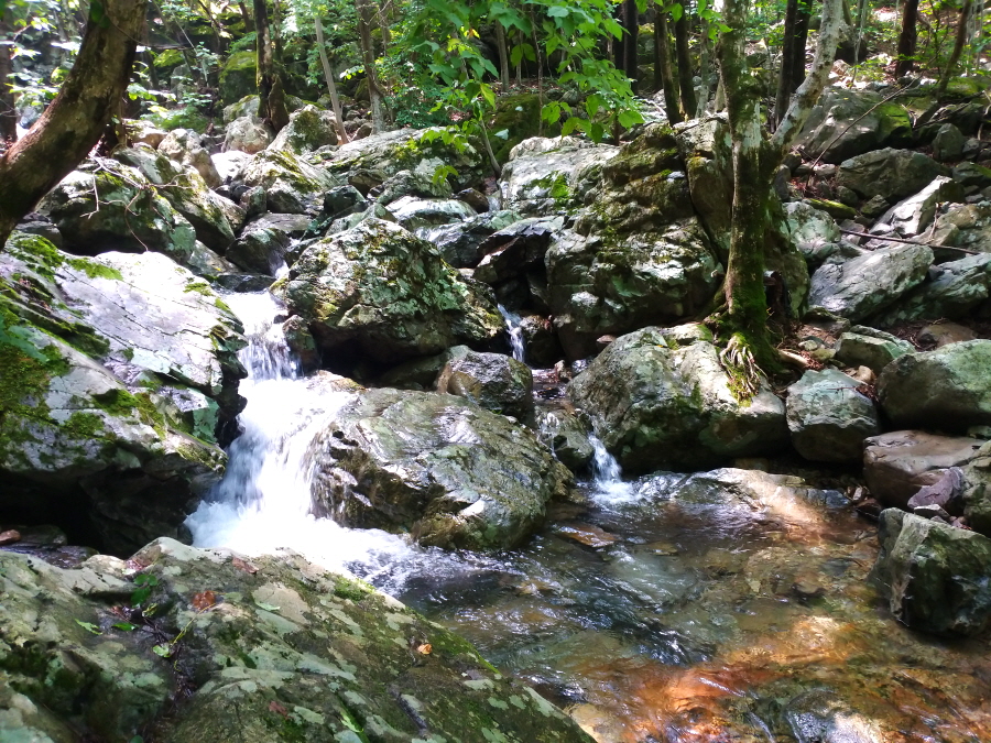 직진해 계곡을 따라 갑니다. 오른쪽은 시살등 방향 능선길입니다. 약 4.5분이면 청수좌골과 우골이 만나는 합수점에 걸린 와폭이 나옵니다. 여기서 오른쪽 계곡은 우골이며 왼쪽 계곡은 사유지로 출입이 통제된 좌골입니다.