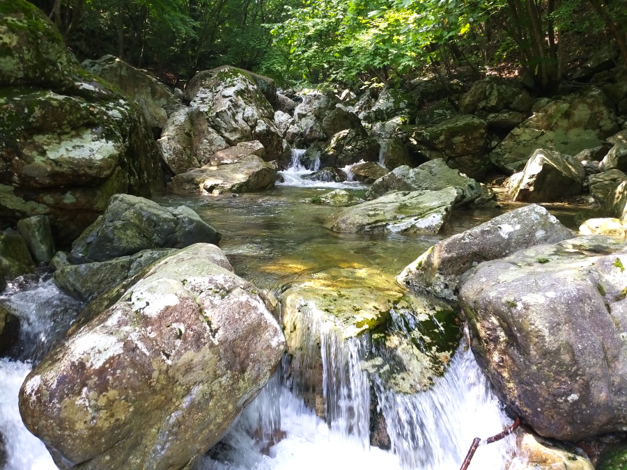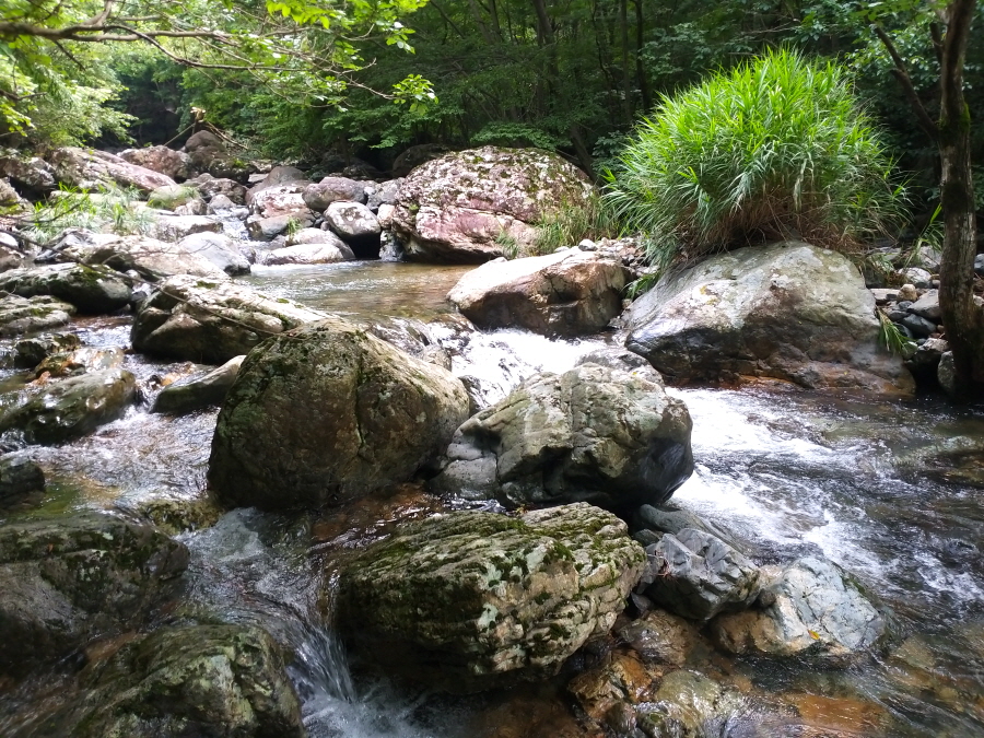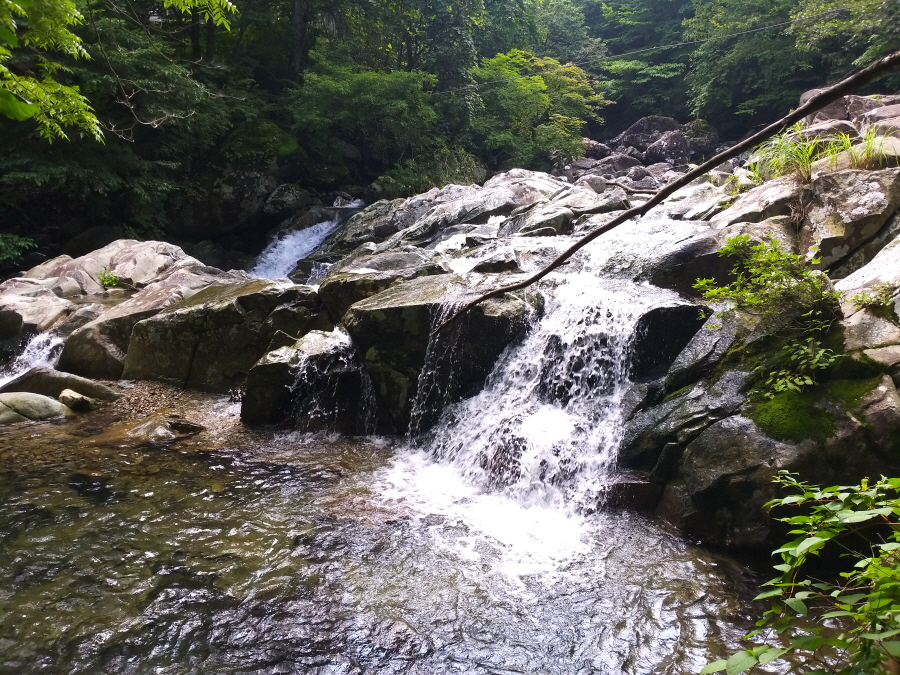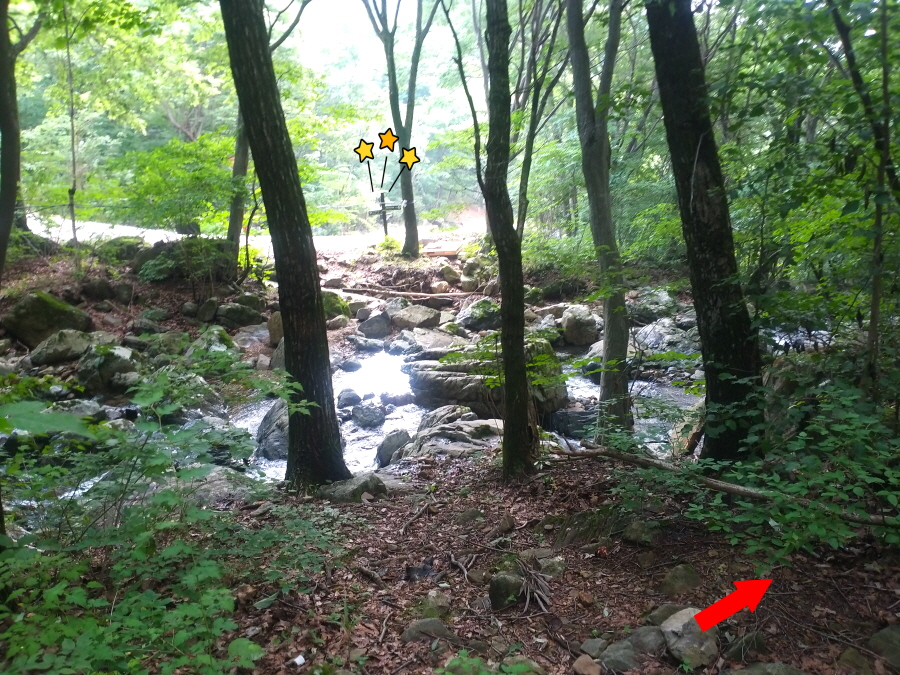 편백 개서어나무 상수리나무 산죽 등 활엽수가 만든 숲은 삼림욕장을 떠올리게 합니다. 합수점에서 1시간30분이면 첫 번째 계곡을 건너며 이후에도 두 번 더 계곡을 지납니다.