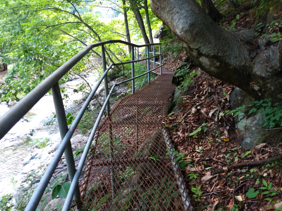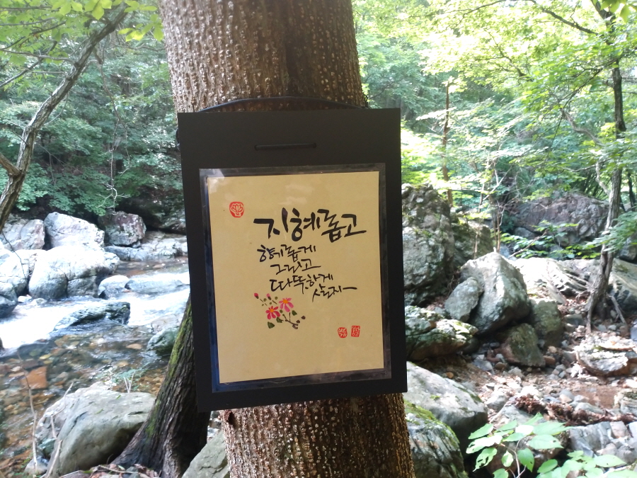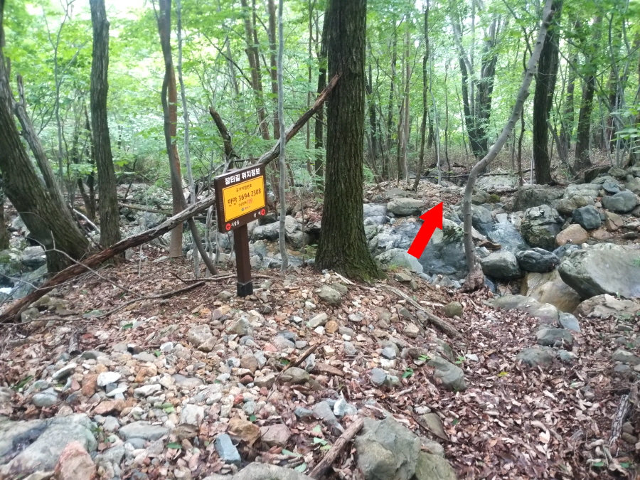 깊은 계곡에 작은 폭포와 소가 잇따라 걸려 있습니다. 장터길 위치 정보 안내판이 길잡이가 되어 줍니다.