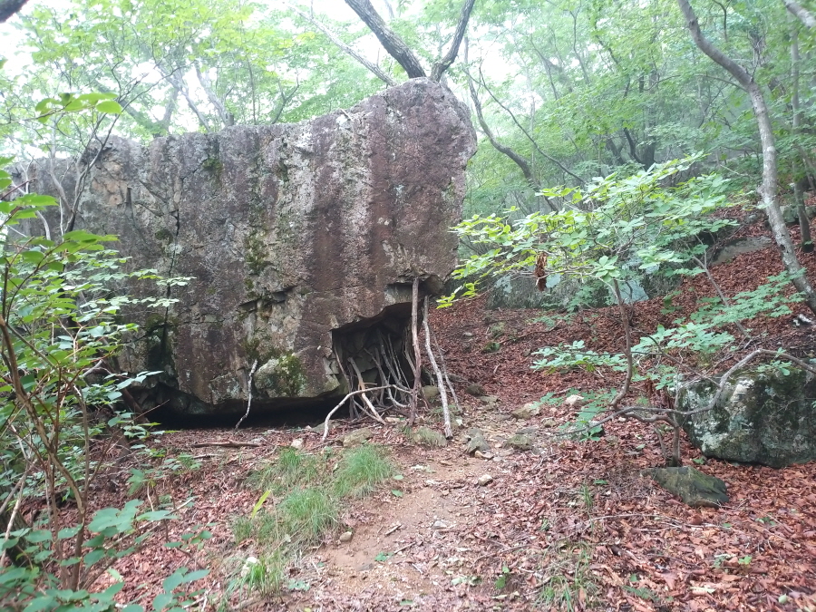 토끼길 같은 산길은 곧 도술을 부린 신동대가 살았다는 길이 40m, 폭 10m즘 되는 석굴에 닿습니다. 신동대굴을 나와 통도골로 내려갑니다.