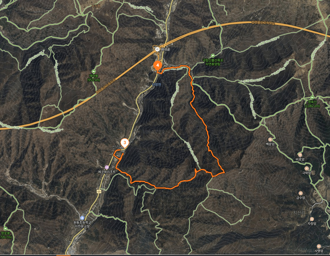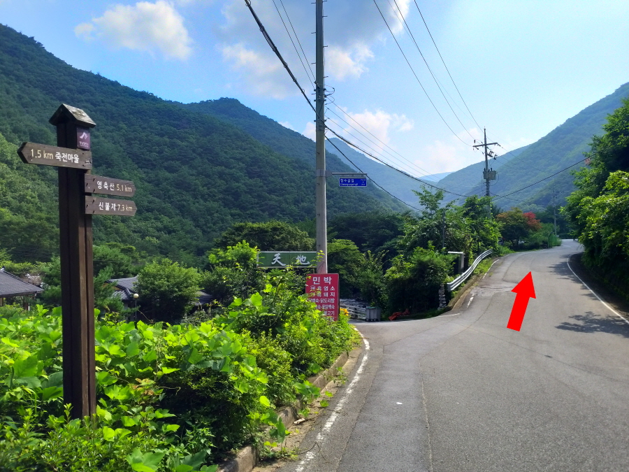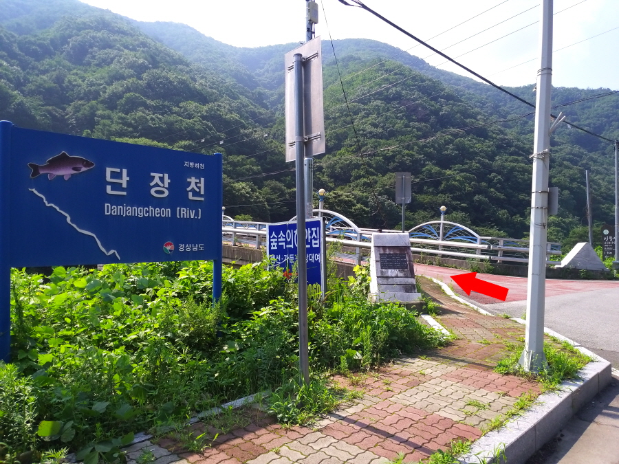 양산시 파래소폭포배내골종점정류장에서 출발합니다. 정류장 오른쪽에 신불산자연휴양림 방향 단장천(배내골)의 태봉교를 건너갑니다. 파래소 유스호스텔 입구를 지나면 이정표 갈림길, 왼쪽 신불산자연휴양림으로 도로를 걷습니다. 오른쪽은 배내천 트래킹길(고점교·9.77㎞)입니다.