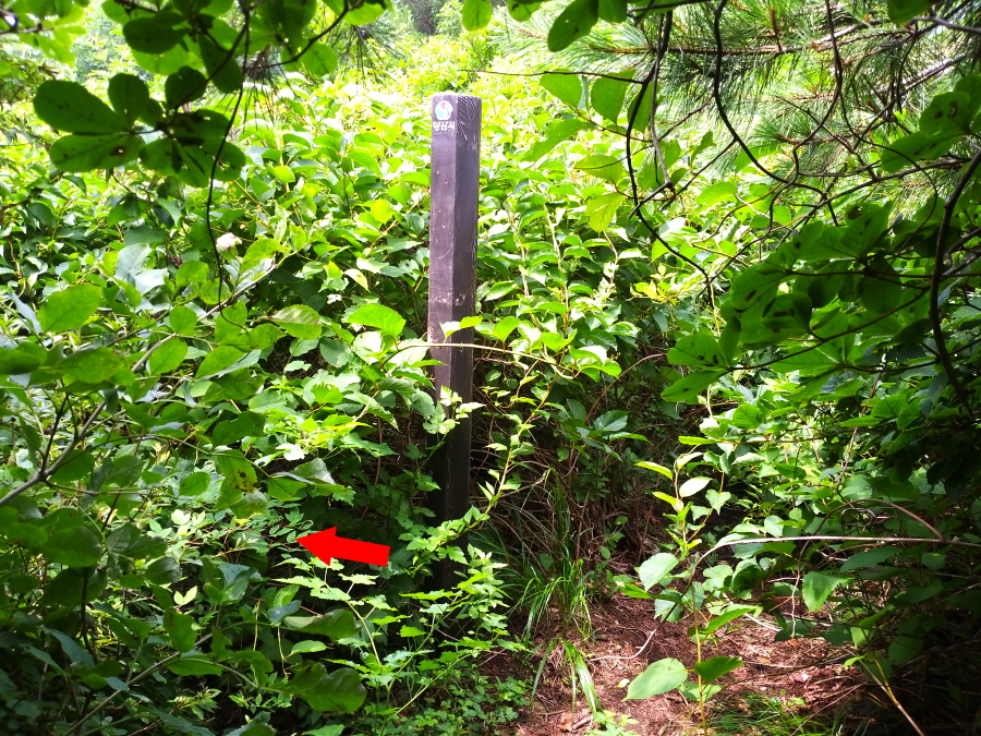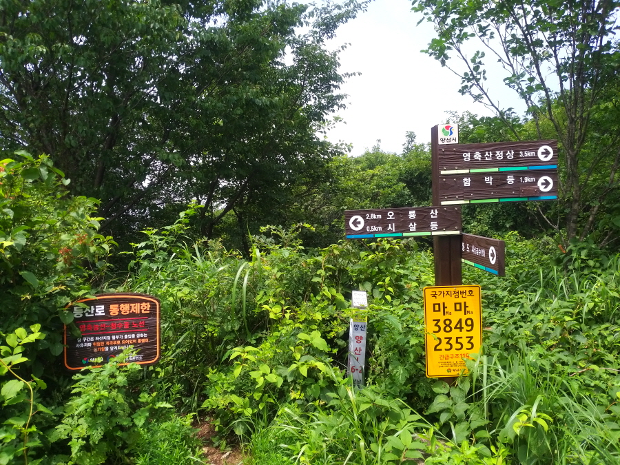 필자는 한피골로 불리는 우골을 건너자마자 두 계곡이 만나는 가운데 산길로 들어섰습니다. 곧 영남알프스 안내도 팻말이 왼쪽에 보이는 사거리가 나옵니다.