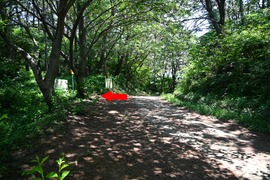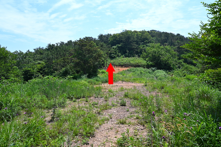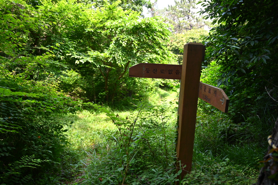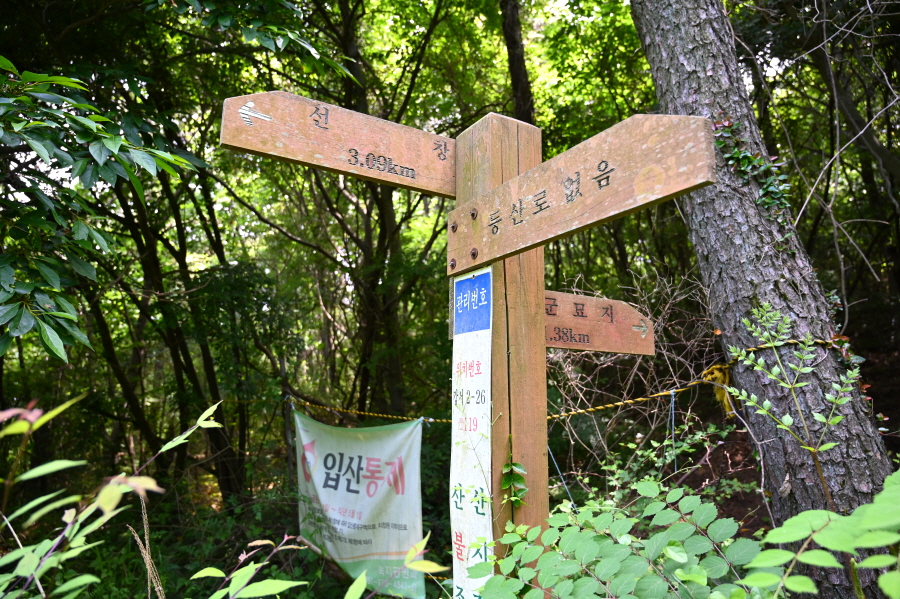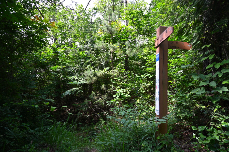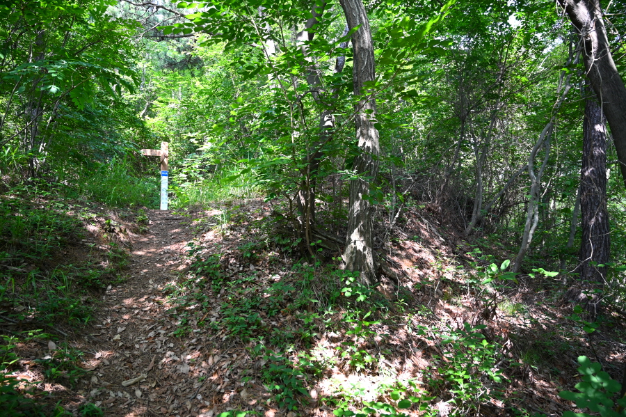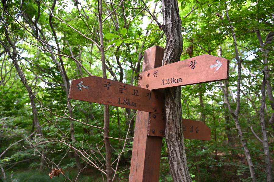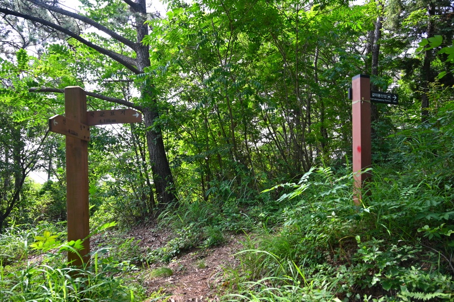 너른 평지를 가로질러 소사나무 숲을 빠져나갑니다. 15분이면 임도에 내려서고, 국군묘지(1.52㎞)는 왼쪽으로 꺾습니다.