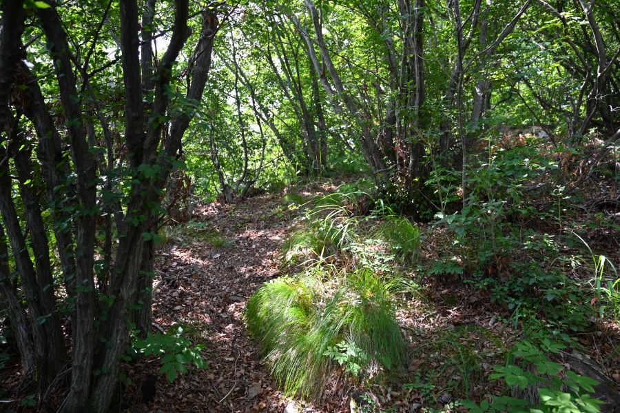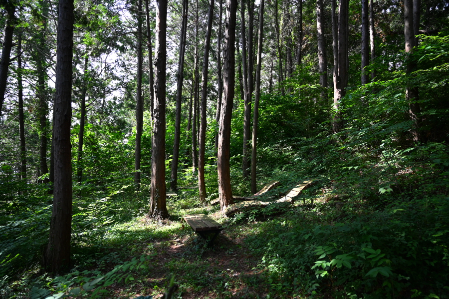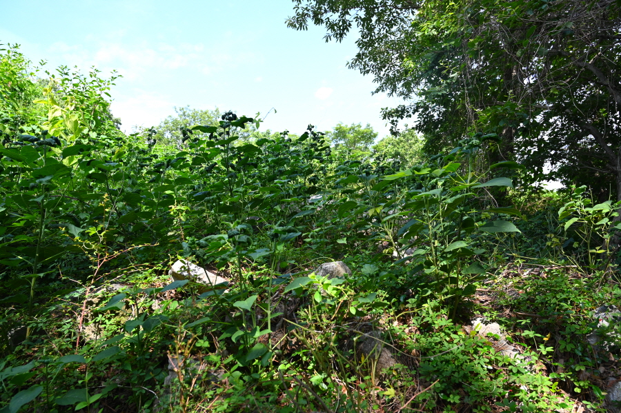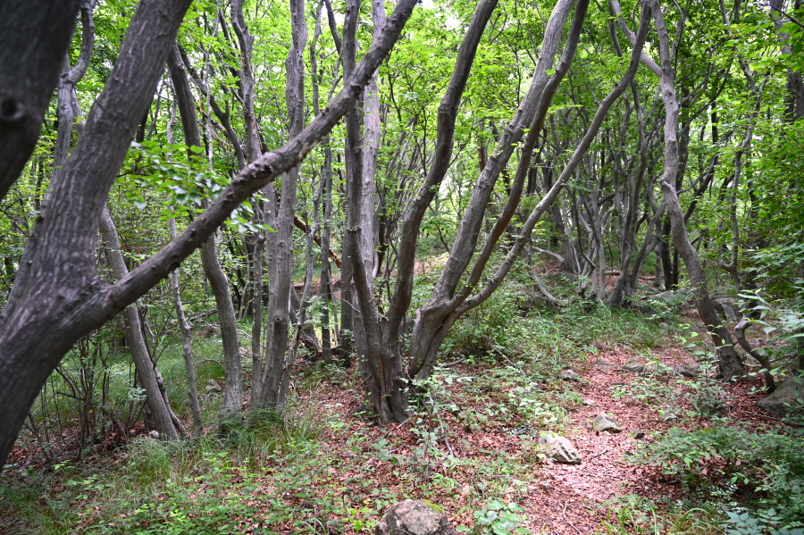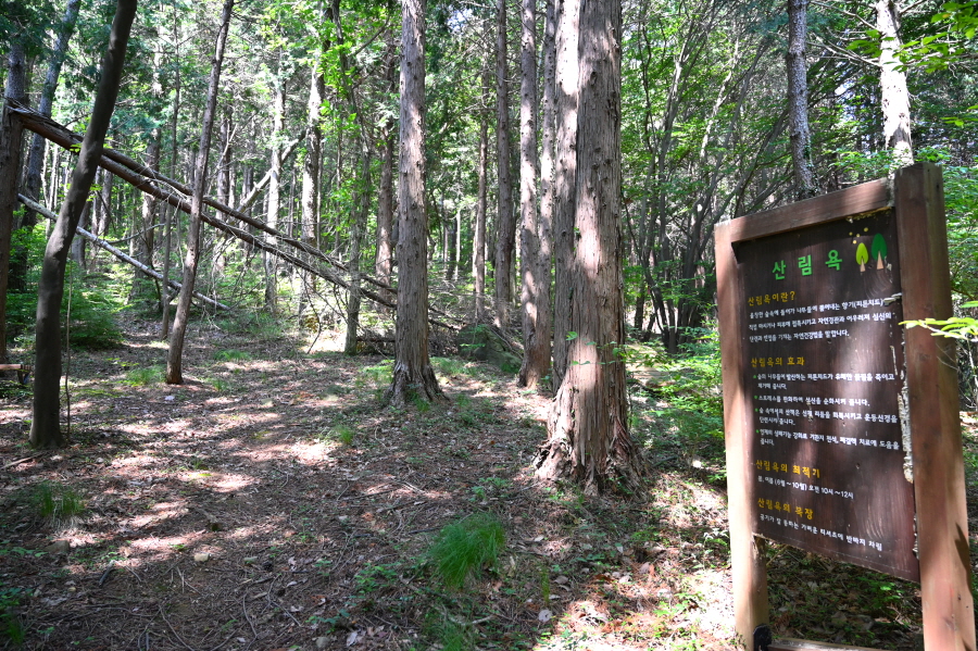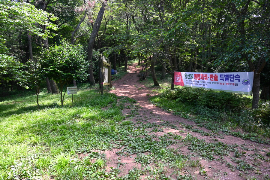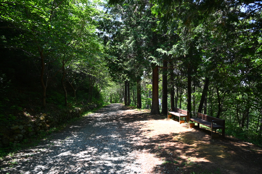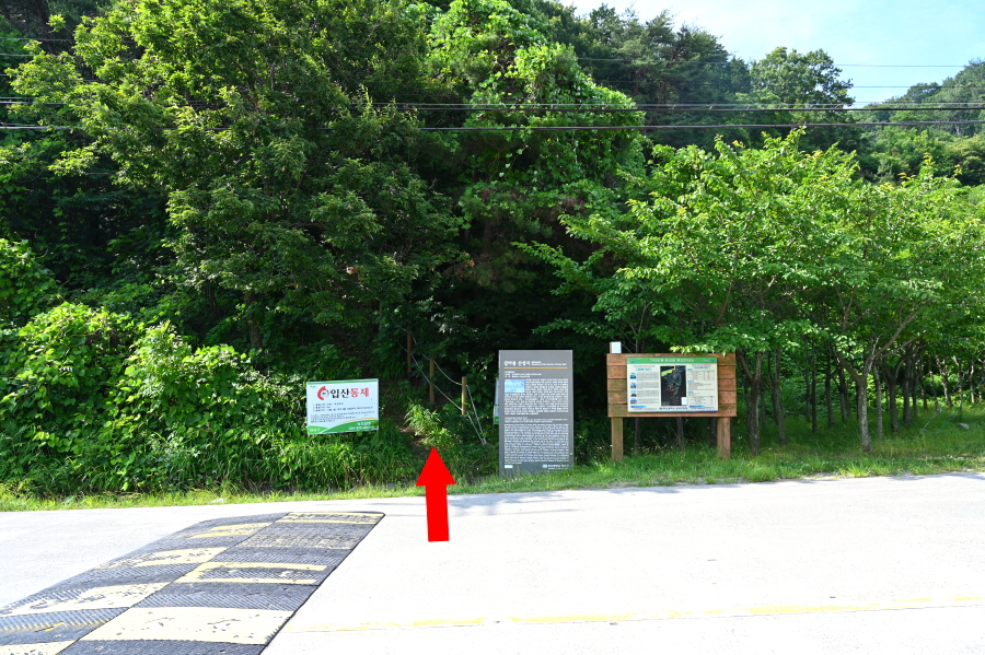 너른 평지를 가로질러 소사나무 숲을 빠져나갑니다. 15분이면 임도에 내려서고, 국군묘지(1.52㎞)는 왼쪽으로 꺾습니다.
