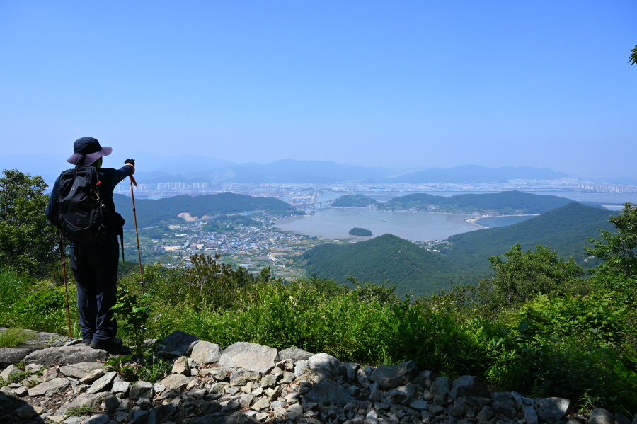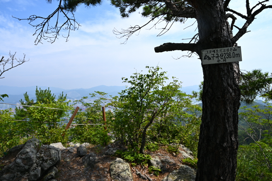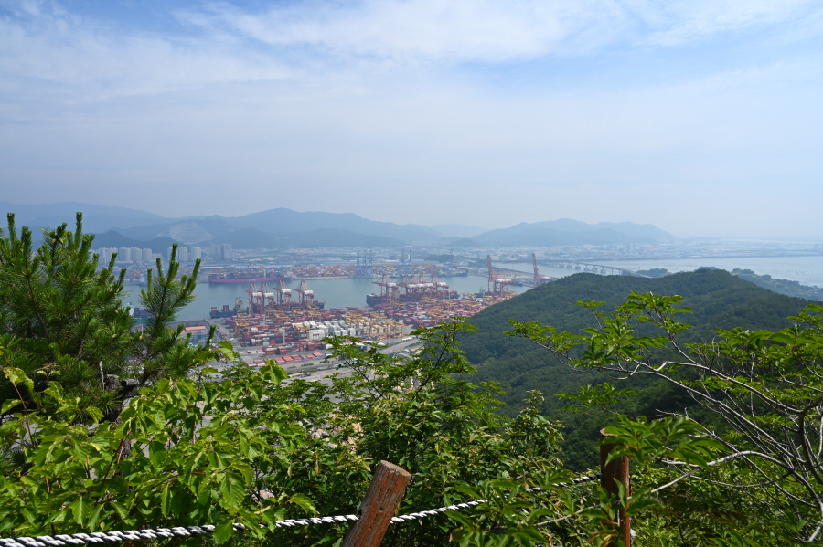들머리에서 약 50분이면 구곡산 정상에 섭니다. 북쪽으로 신항만 컨테이너 부두 뒤로 멀리 시루봉 불모산 화산 굴암산 보배산 봉화산 등이 펼쳐집니다.