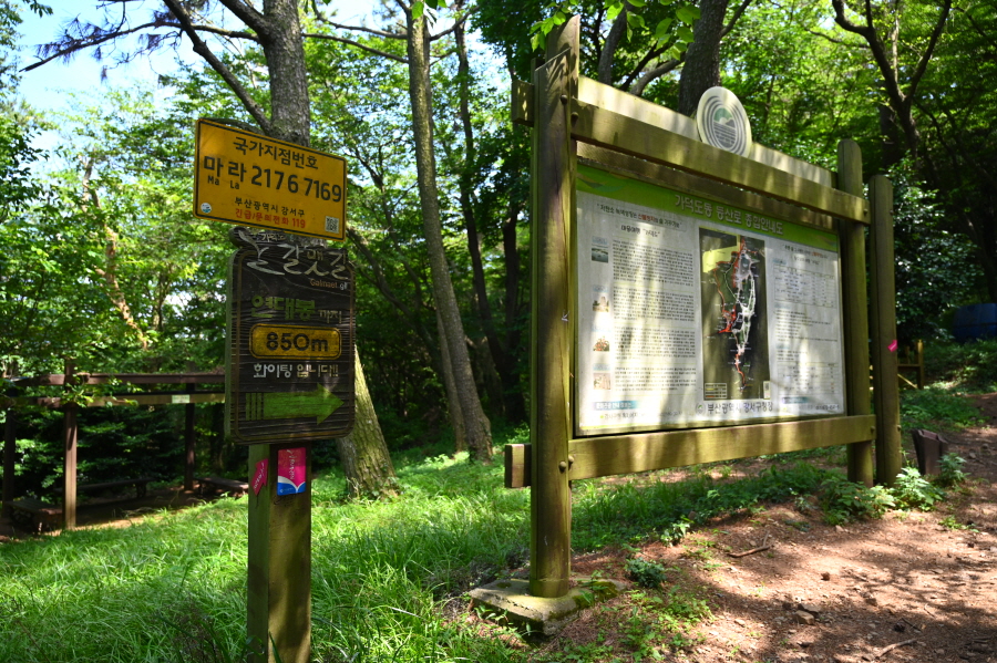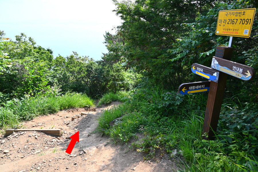 갈맷길 포토존을 거쳐 15분이면 ‘국가지점번호 마라 2155 7211’ 표지판이 서 있는 천성고개에 올라섭니다. 왼쪽 산길로 들어섭니다. 오른쪽 임도는 어음포 고개로 해서 연대봉으로 바로 갑니다.
