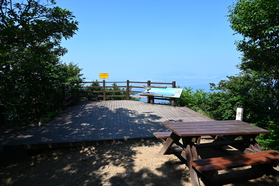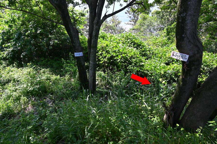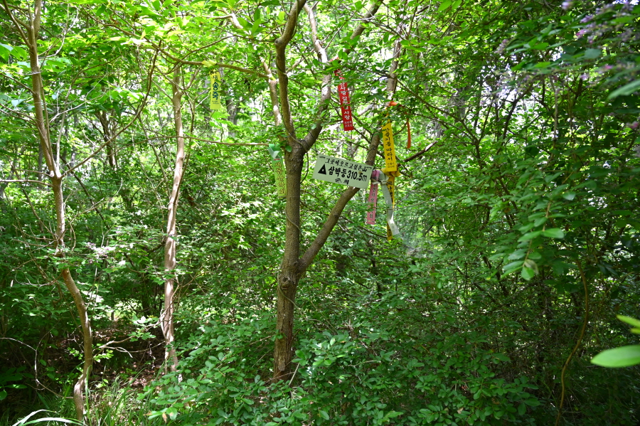 신항만과 눌차도 전망대 한 곳을 지나 25분이면 갈림길이 나옵니다. 직진해야하지만 오른쪽 삼박봉을 10분이면 갔다 옵니다. 삼각점과 정상 팻말만 있을 뿐 조망은 없습니다.