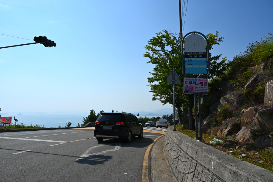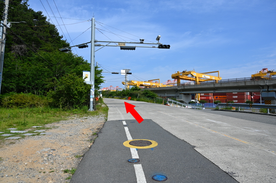 가덕도 선창종점에서 출발합니다. 버스가 들어왔던 율리·장항 방향으로 되돌아 나가 1분이면 가덕도 관광 안내도 앞 삼거리에 도착합니다. 왼쪽 천성 방향 ‘가덕해안로’ 콘크리트도로를 갑니다. 오른쪽은 갈맷길 5-2구간인데, ‘신항 입구’ 방향입니다.