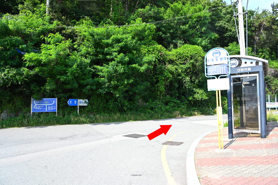 2,3분이면 갈림길이며 지양곡(1.4㎞)으로 바로 갑니다. 왼쪽은 대항새바지 방향. 너른 길을 따라 약 25분이면 산불초소를 지나 지양곡버스정류장에 도착합니다.
