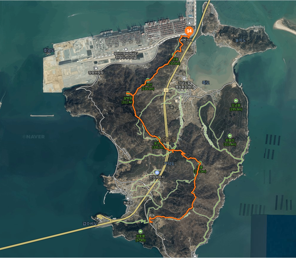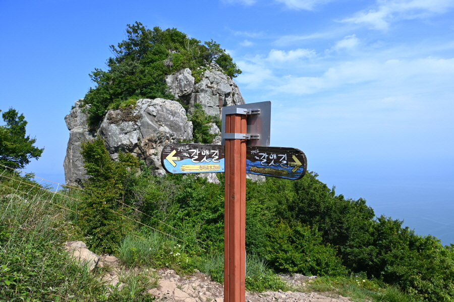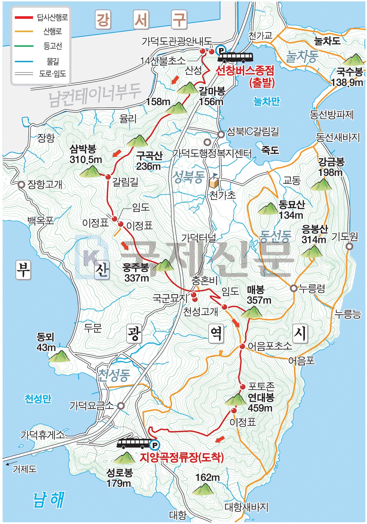 산행 경로를 보면 부산 강서구 성북동(가덕도) 선창버스종점~가덕도관광안내도 앞 도로 삼거리~14산불초소 들머리~~갈마봉산성~갈마봉~구곡산~삼박봉 갈림길~삼박봉~삼박봉 갈림길~임도 갈림길~웅주봉~국군용사충혼비~국군묘지~천성고개~매봉~어음포 고개(8 산불초소)~전망 덱(포토존)~연대봉~지양곡·대항새바지 갈림길~백재덕 추모 쉼터를 지나 지양곡버스정류장에 도착합니다. 산행거리는 약 9.5㎞이며, 산행시간은 4시간30분 안팎 걸립니다. 날씨가 무덥다면 식수를 보충할 곳이 따로 없어 미리 충분히 준비합니다.