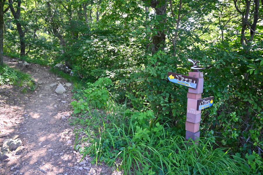 연대봉은 직진하며 850m 남았습니다. 왼쪽은 물고기 소리가 들릴 만 큼 고기가 많았다는 어음포로 내려가는 길이며, 오른쪽은 연대봉을 우회해 지양곡으로 곧장 가는 임도입니다.