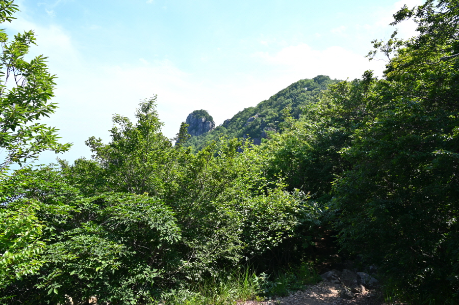 왼쪽에 엄지손가락을 닮은 암봉과 연대봉 정상을 산 아래에서 보면 ‘낙타 등’을 닮아 낙타등바위로도 불립니다. 여기에도 불을 피웠던 봉수 흔적이 남아 있습니다.