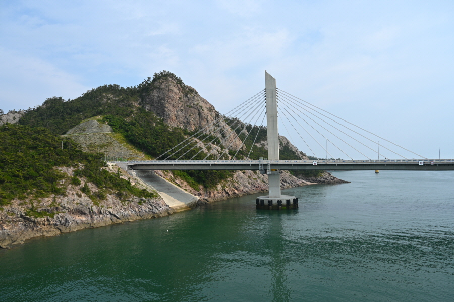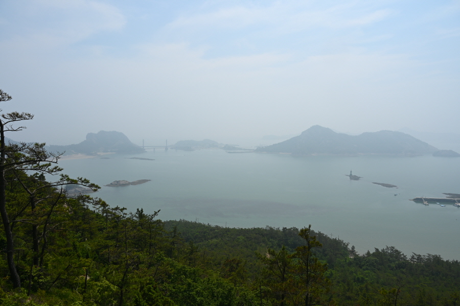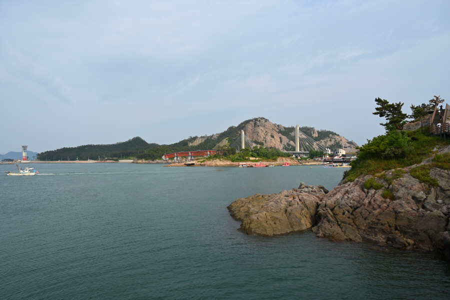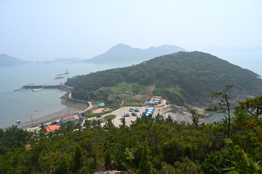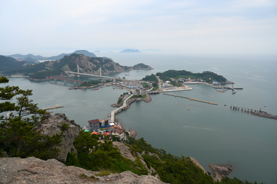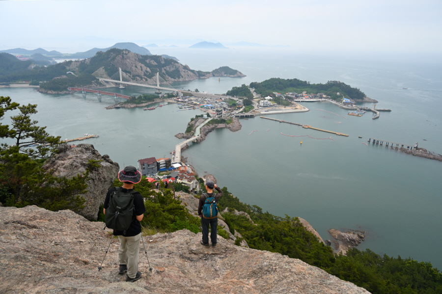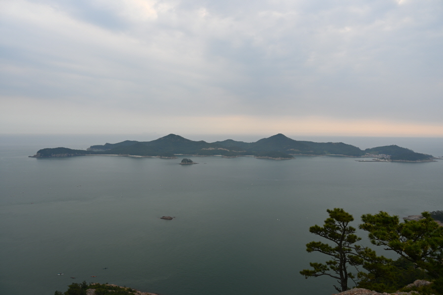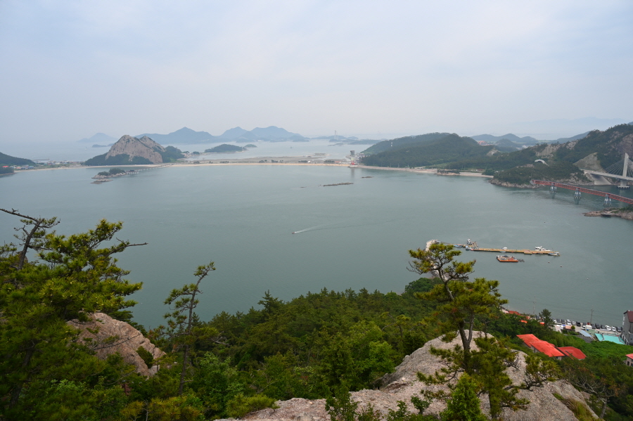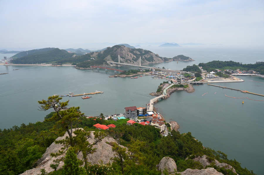 오른쪽 고군산군도에 속한 관리도와 장도에서 선유도를 연결한 장도대교 뒤로 바위 벼랑인 선유봉과 멀리 무녀도가 보입니다.