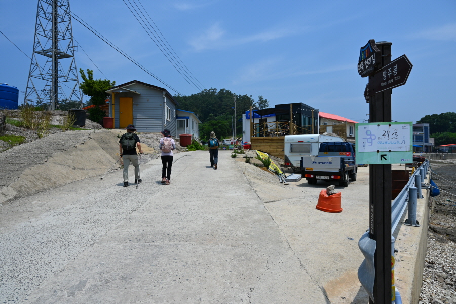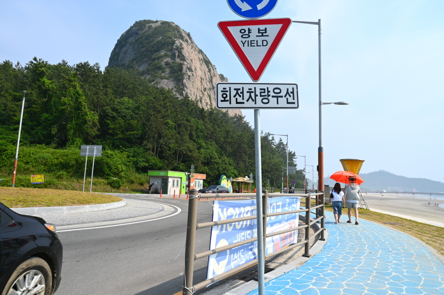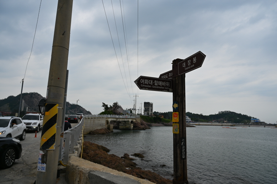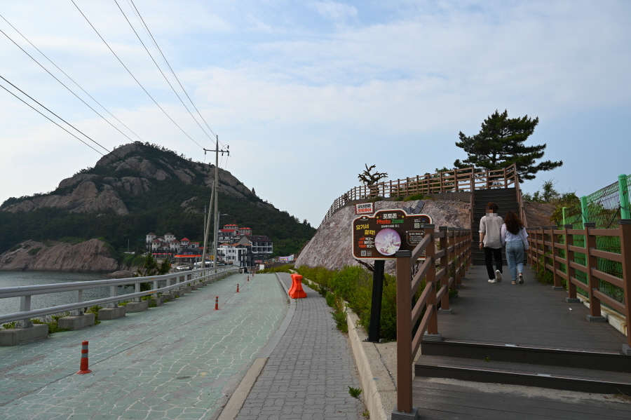 여기서 구불길은 두 길. 취재팀은 오른쪽으로 도로를 건너 망주봉 앞으로 콘크리트 해안 길을 갑니다. 직진 길은 몽돌해변과 대봉 전망대로 곧장 가는 길입니다.
