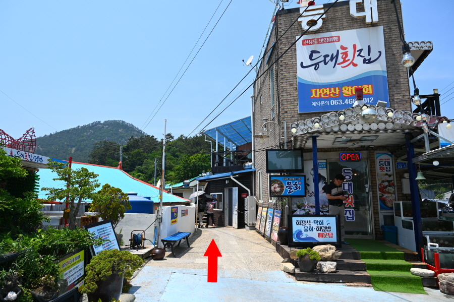 망주봉 뒷면을 돌아 고래섬 회 식당 앞 갈림길에서 선유 3구 선착장·기도등대로 직진합니다. 왼쪽은 명사십리해수욕장·구불길(대봉) 방향입니다.