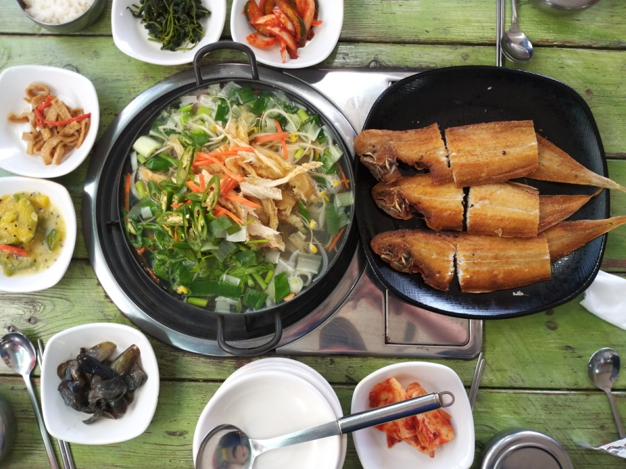 맛집 한곳 추천합니다. 서해에 가야 맛보는 박대구이와 황태바지락해장국은 선유도보건지소 공영주차장 안쪽의 ‘남도밥상(010-6603-6245·사진)’이 괜찮습니다. 참서대과인 박대는 육질이 단단하며 고소하고, 갯벌이 많은 서해안에서 잡히는 바지락은 국민조개로 불릴 만큼 국물이 시원합니다. 박대구이 1인 1만5000원, 황태바지락해장국 1인 1만3000원. 각 2인 이상