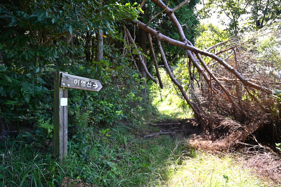 지리산 영신봉에서 출발한 이 길을 정맥 종줏꾼은 백두대간의 꼬리를 뜻하는 ‘우듬지’로 부르는데, 이명산 시루봉(계봉)을 경유해 남해대교에 이릅니다. 첫번째 갈림길을 통과하면 이명산 이정표가 나옵니다.
