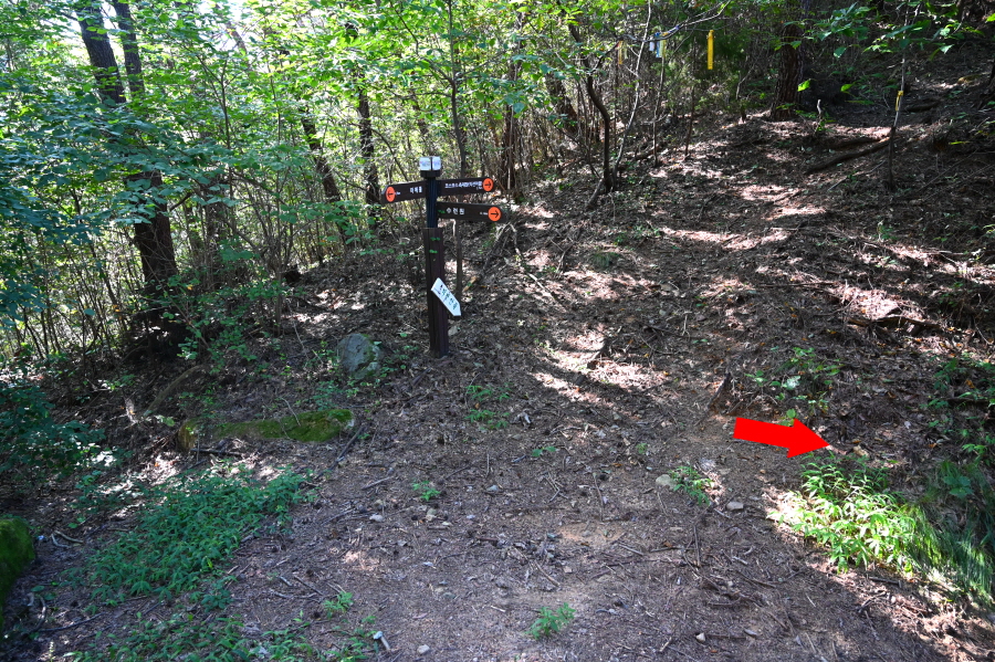 상사봉 정상(0.6㎞)은 직진합니다. 오른쪽은 진교면 월운 임도에서 올라오는 길. 거칠게 오를 것 같은 산길도 잠시, 5분이면 이정표 삼거리입니다. 이명산(0.5㎞)은 오른쪽으로 꺾습니다.