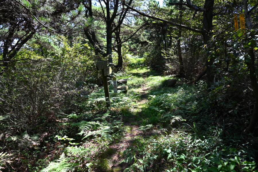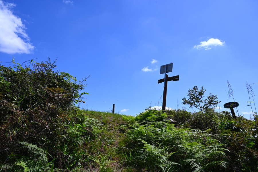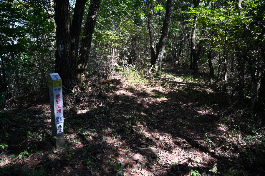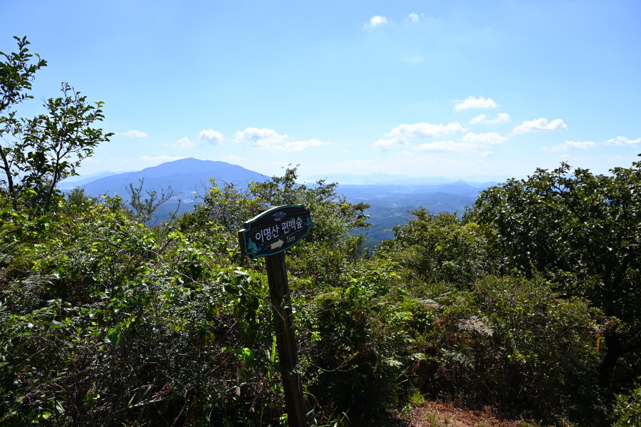이명산(상사봉 정상·1.7㎞)을 보며 직진합니다. 남쪽은 개고개·편백숲 방향이며, 남해대교로 가는 백두대간 우듬지 길입니다.